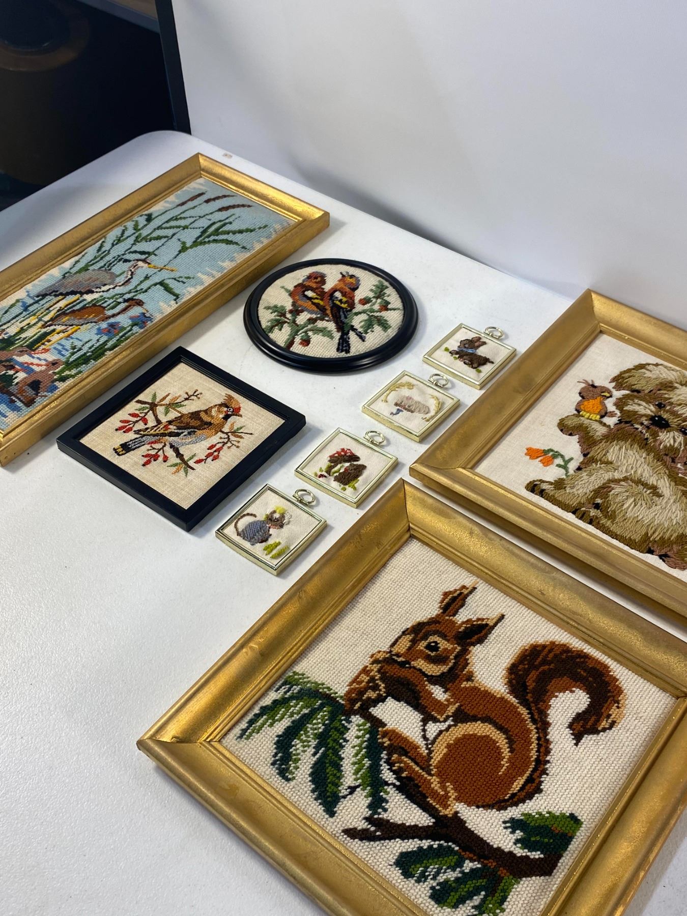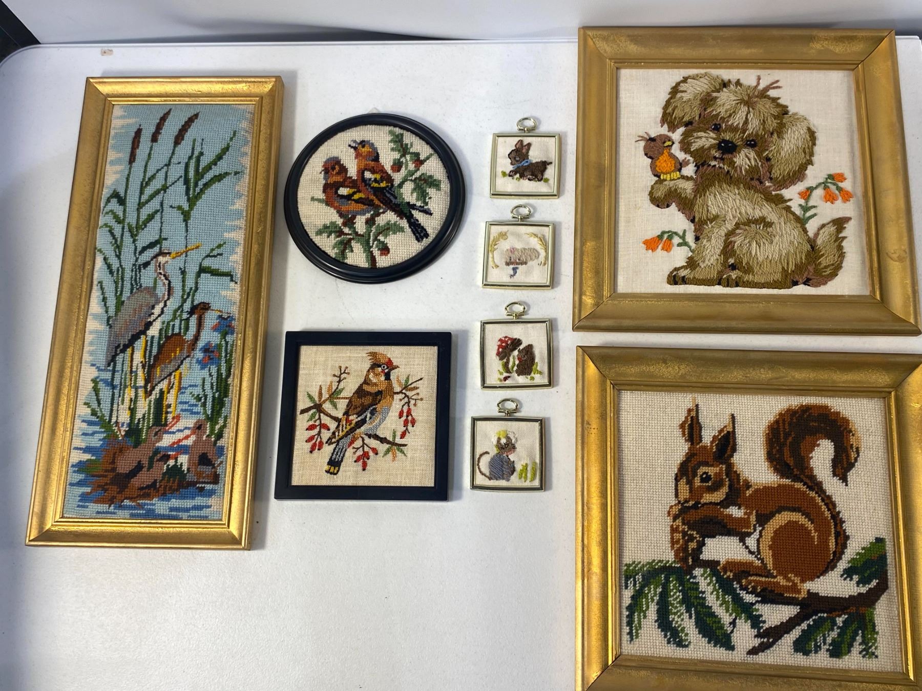 Group of framed needlepoint pieces featuring birds, animals, and nature scenes. Approx. late 20th century. Condition: light wear.