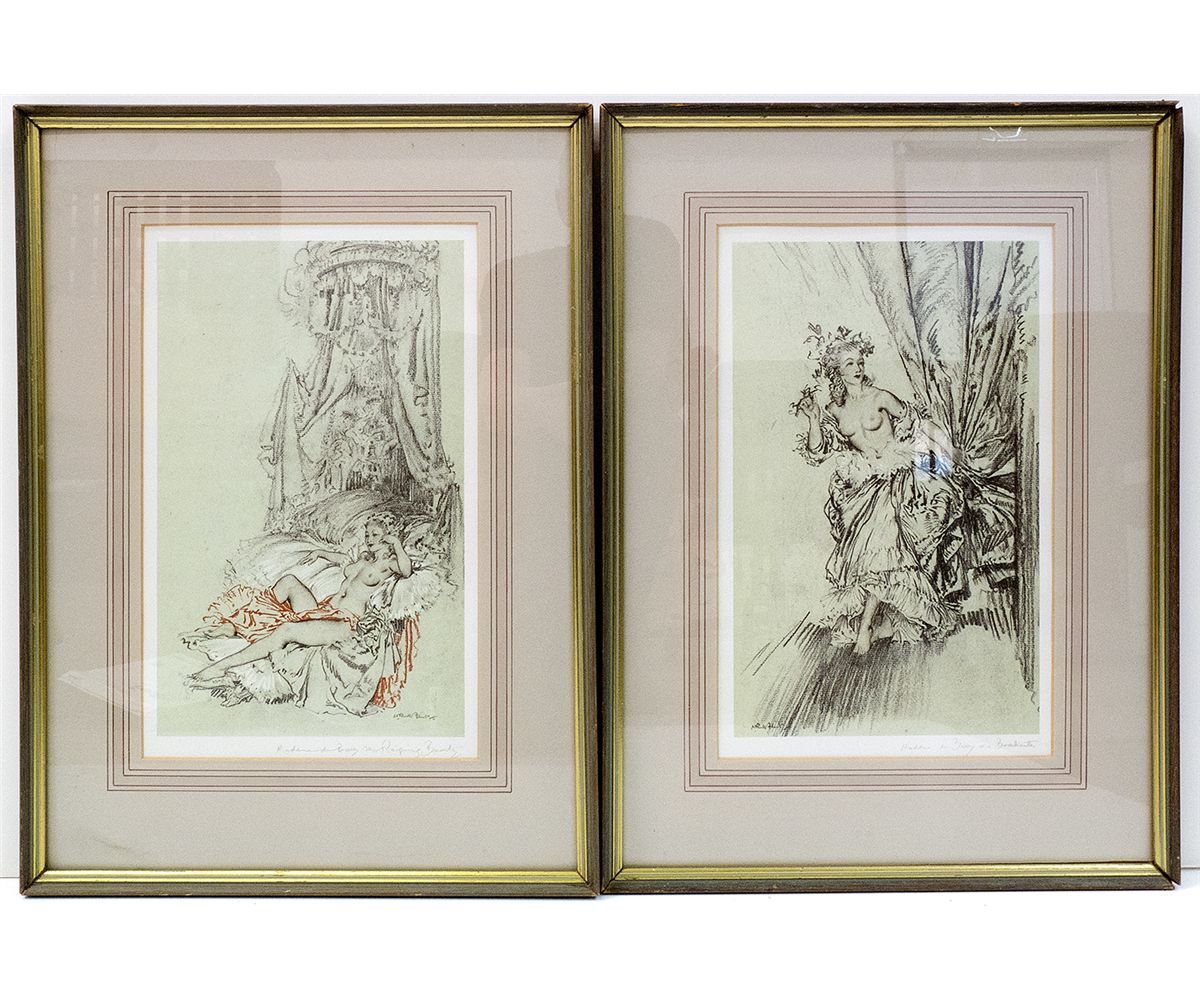 Lot of 2: lovely color lithos of tasteful nudes, titled "Madame du Barry as a Bacchante" and "Madame du Barry SecReigning Beauty" Both are handsomely framed. The frames measure approx. 24" x 16.5". A nice collection. Fairbanks Collection - HKA#66078