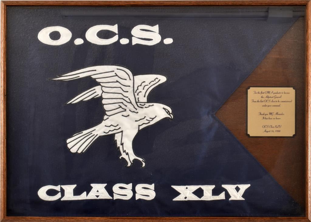 Brass plaque reads "For the first OMA graduate to become the Adjutant General. From the last OCS class to be commissioned under your command. Thank you MG Alexander. It has been an honor." OCS Class XLV August 16, 1998. Frame measures 21" x 29"