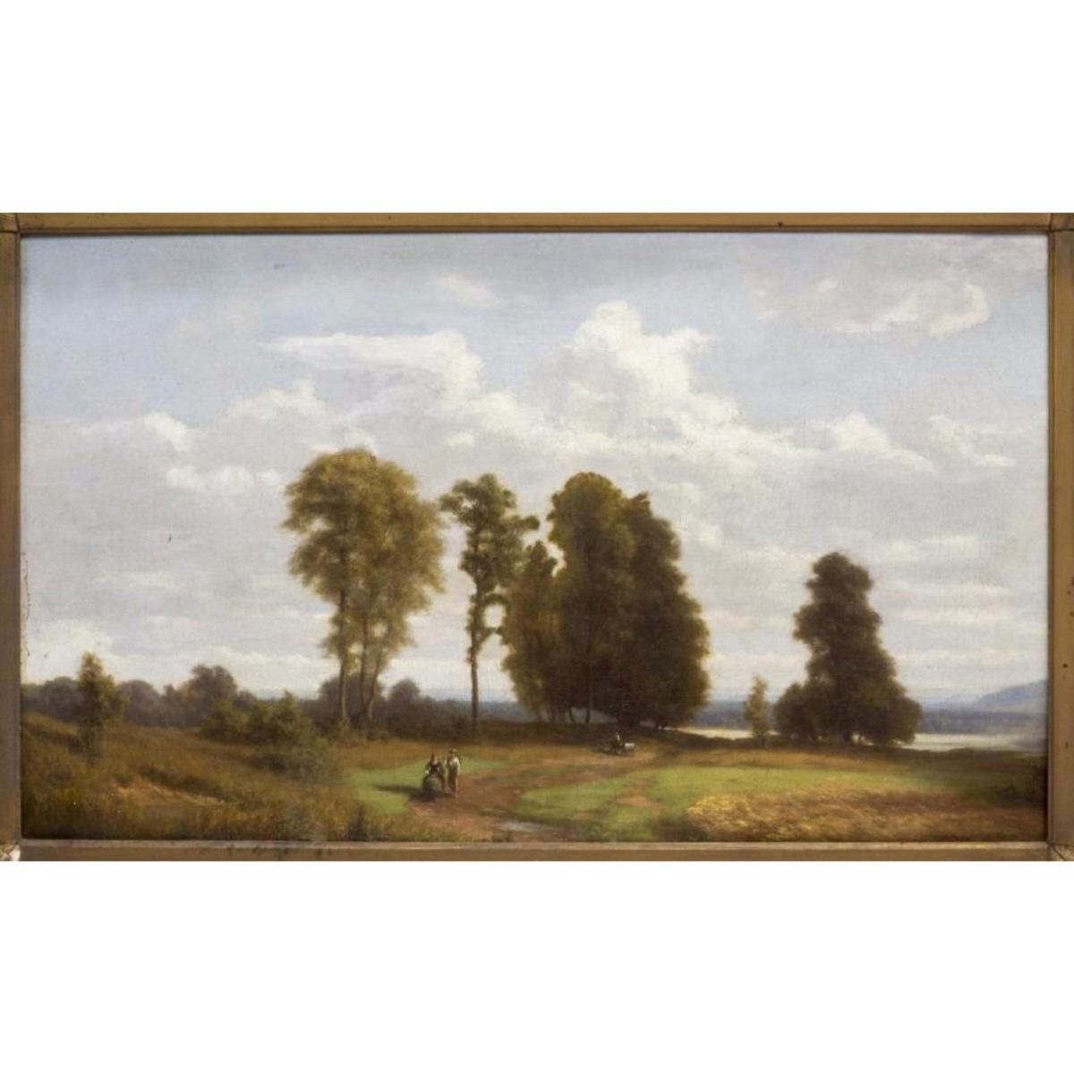 Framed oil painting on board, early 20th c., Landscape with Figures, unsigned, label on back reading "Tribute to John Gardner Low," evidence of craquelure, some gilt loss to frame, sight: 21.25"h, 35.25"w, overall: 31.25"h, 45.25"w, 30lbs