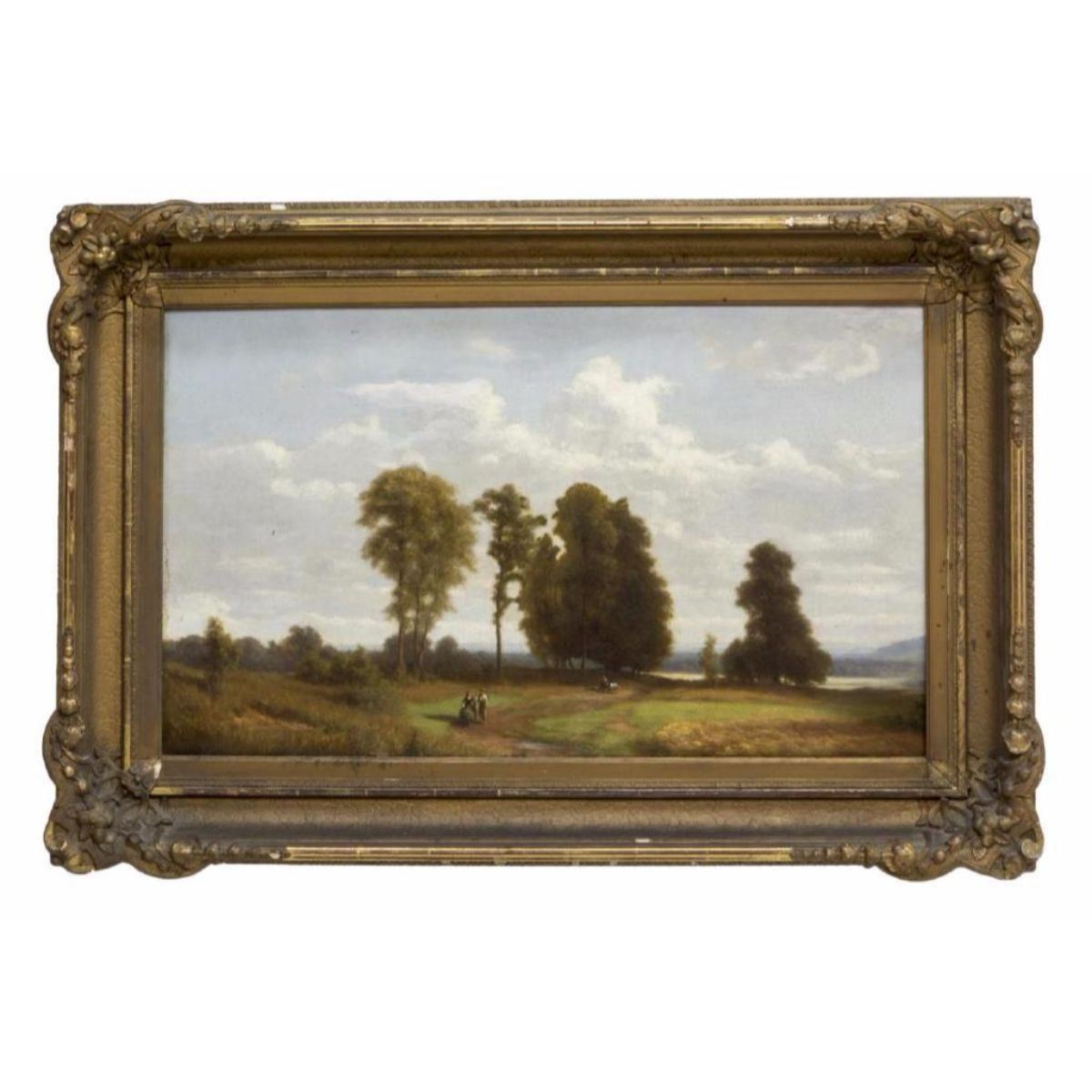 Framed oil painting on board, early 20th c., Landscape with Figures, unsigned, label on back reading "Tribute to John Gardner Low," evidence of craquelure, some gilt loss to frame, sight: 21.25"h, 35.25"w, overall: 31.25"h, 45.25"w, 30lbs