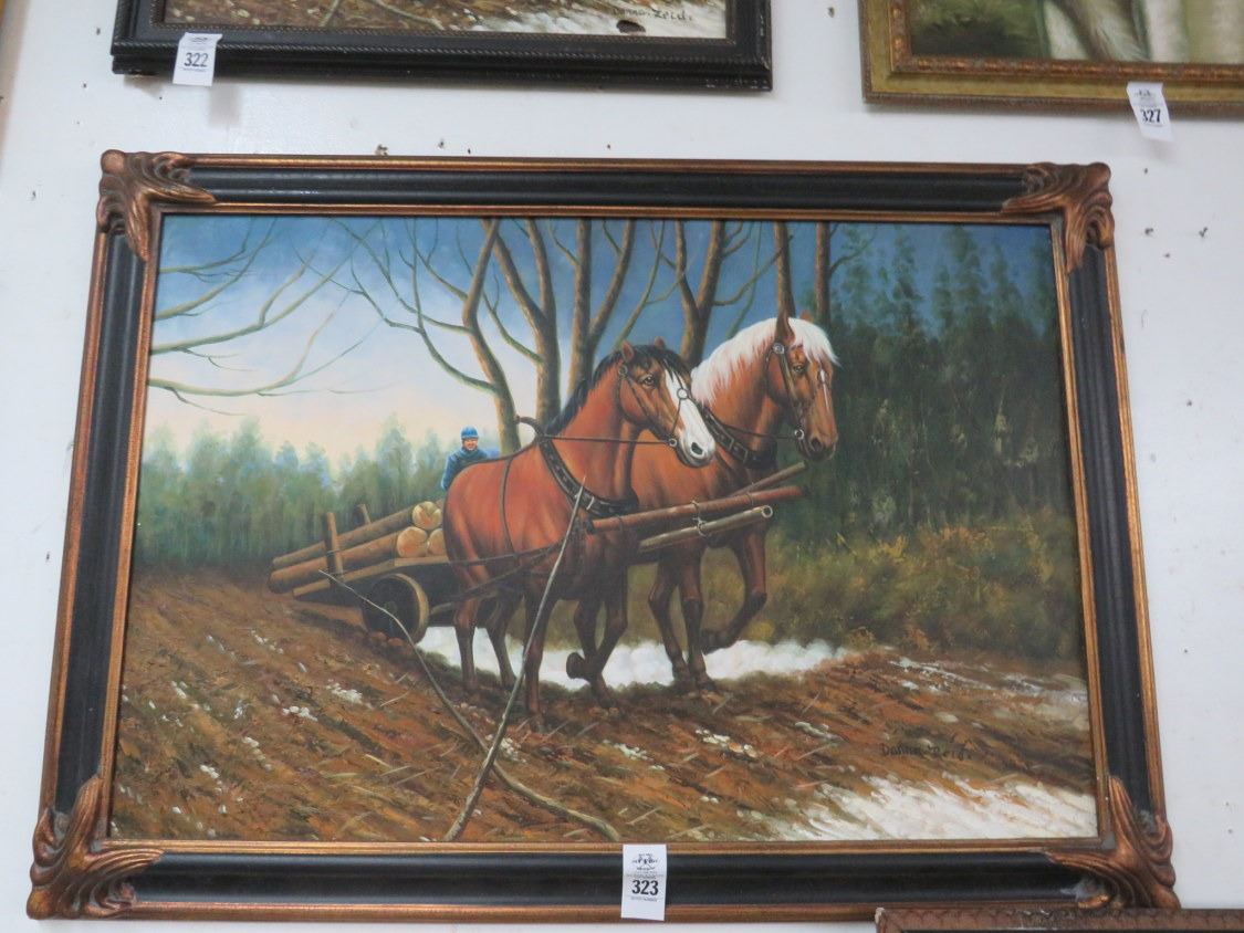 Framed Oil On Canvas Horses Pullig Logs - 24 X 36