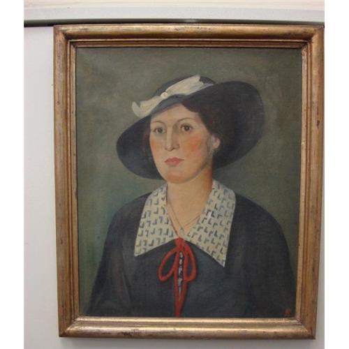 Framed oil painting on canvas. Signed and dated by artist (Francis A. Coll, 1934). This painting originated out of Wilmington, Delaware. Research on the artist revealed that he was the only professional picture frame carver working in Delaware in the late twenties through the 1940's and 50's. He apparently also enjoyed painting on occasion. This is a portrait of a woman known only as "Miss Johnson."
