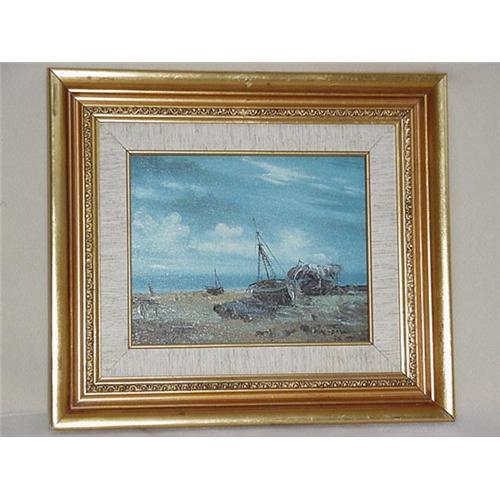 An oil painting on canvas covered board, image 8'' X 10'', frame 14 '' x 16''. A companion piece to # 3466-101, Depicting seaside scenes of fishing boats and fishermen tending their nets. Signed Dali 78 lower right. Signed on back "Margarita de Fronseca 78.