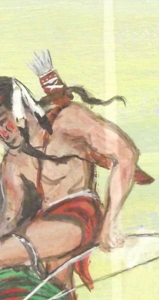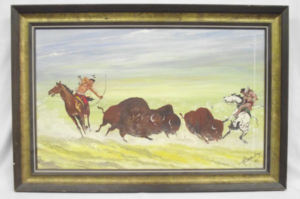 Framed Oil of Buffalo Hunt - Native American Cree Artist H Beaudry. Original Painting on Hardboard by Henry Beaudry. Measures 17.5''H x 29''W. In wood frame. The painting has a long drip line/stain on the right side as can be seen it the photogrpah. Born in 1921, Beaudry is a Canadian native of the Poundmaker First Nation. In 1993, Beaudry painted a mural of an eagle for the First Nations Gallery of the Museum of Natural History in Regina. More recently, his artwork was featured in a exhibition at Wanuskewin, culminating in a Remembrance Day feature. He has also presented a painting to the Queen. The artwork of Henry Beaudry hangs in public and private collections nationally and internationally. He also has paintings on display in the Saskatchewan Legislature and the Federation of Saskatchewan Indian Nations.