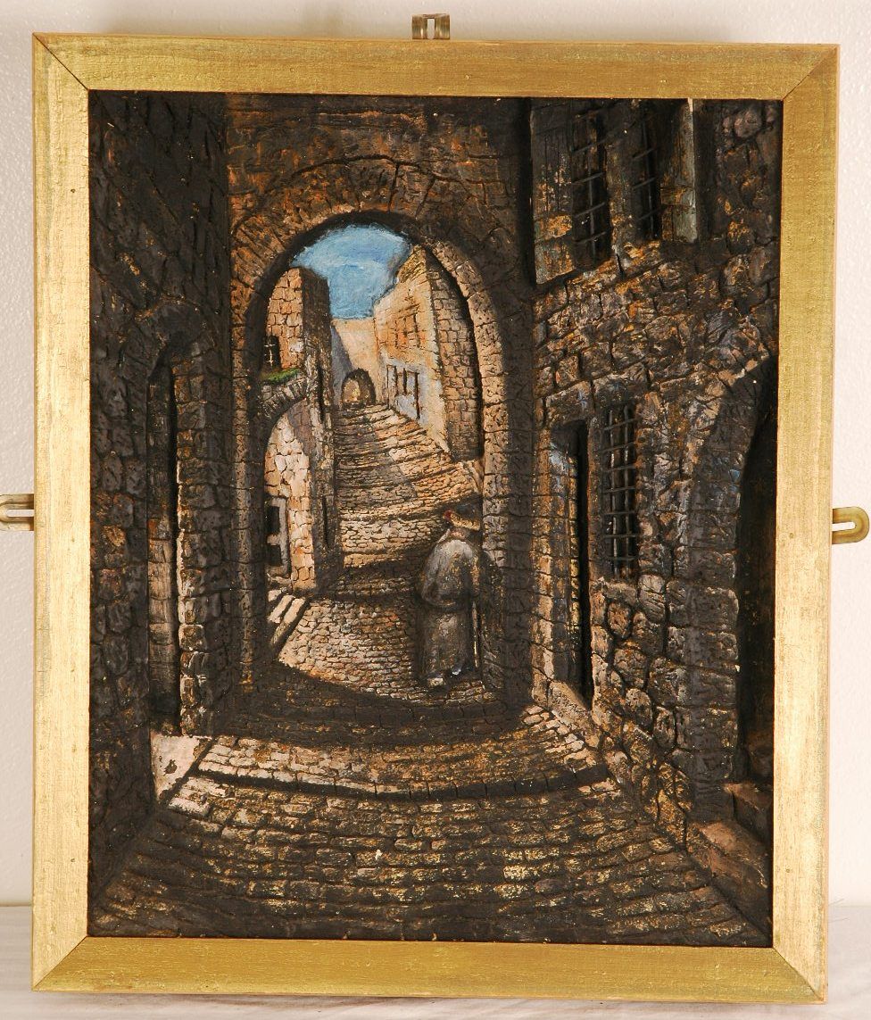 Signed by the artist in the left lower corner. Framed oil on sculpted composition 3D carving of Holy Street in Jerusalem. 19" x 23".