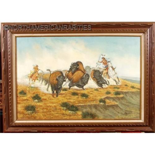 A very good framed contemporary painting, oil on canvas stretcher, showing Native Indians Hunting Buffalo's. Signed in oil lower right corner by Artist T. Morman.