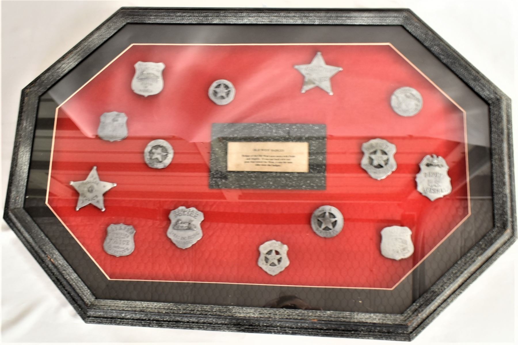 Framed Old West Replica Badges Display, under glass, measures 21.5'' x 30'', ''It was not the barb wire nor the guns that tamed the west, it was themen that wore the badges.''
