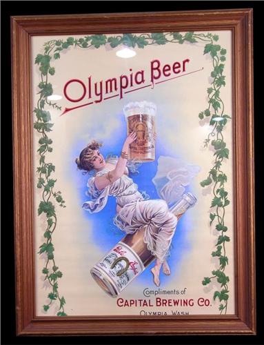 Framed, "Olympia" Beer Girl on bottle, print