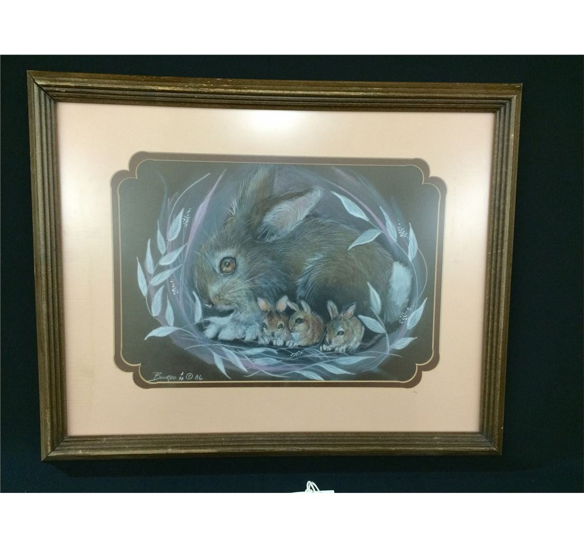 Featuring “Bunnies,” this original framed art measures 20" w x 16". Signed Bourdo, 1986.