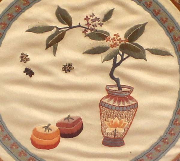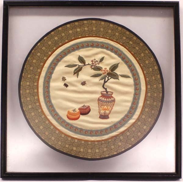 Framed Original Chinese Embroidery Tapestry, inside of a double piece of glass, tapestry measures 12.5''D and total measurement of 15'' x 15'', has original gold label on back which reads ''#7794 100% Silk, Dry Clean Only, ...17322'', beautiful material, intricate needlework