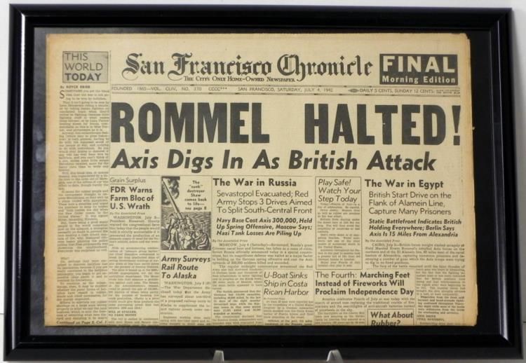 Available is this Framed Original Newspaper Headlined "Rommel Halted". It is from the San Francisco Chronicle and is dated Saturday, July 4, 1942. It measures 20" x 14".