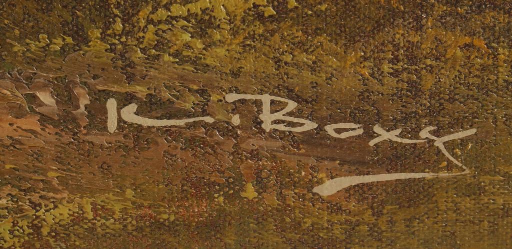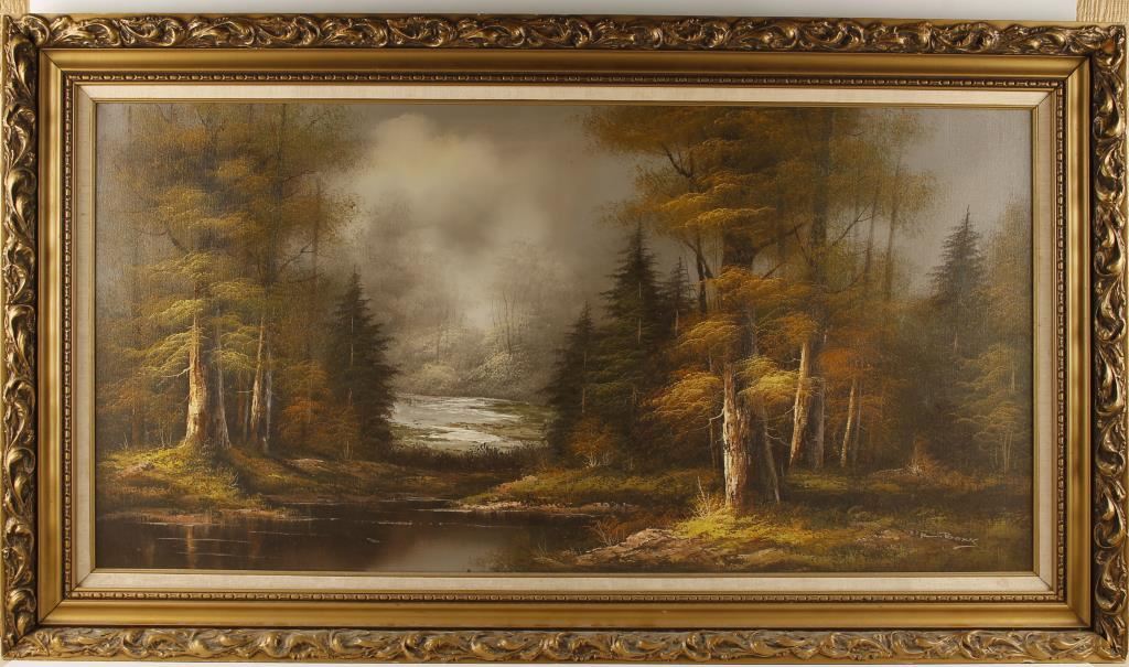 Restful green, gray and gold tones. Image size 23 1/2 "x 47 1/2" by K Boxy. Gold molded frame with fabric inset. It has a minor condition issue as the canvas is misshappen in the center of the painting.