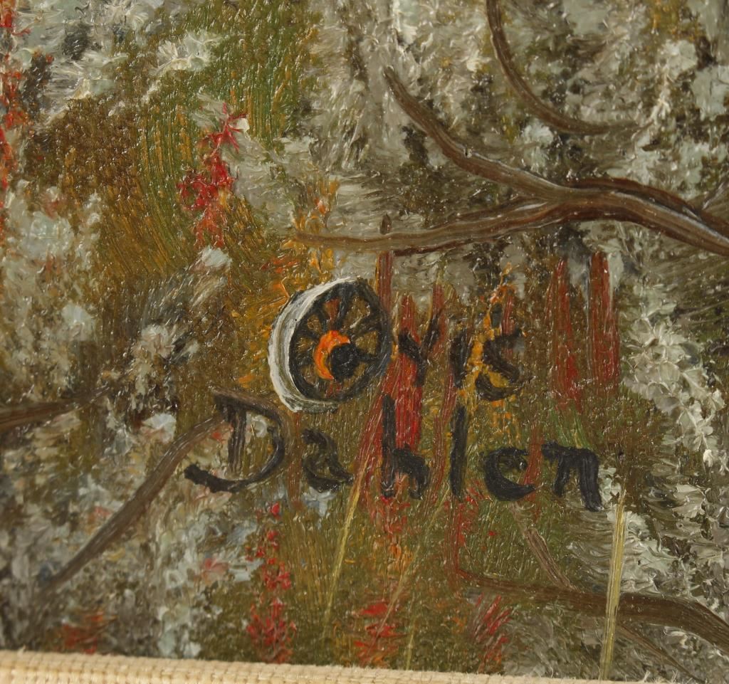 by Artist Oris Dahlen. Born in 1918 on a ranch north of Saco, Montana. She was an able cowgirl and loved talking about her favorite horses. This painting depicts a beautiful rural landscape with a saddled working cow horse waiting while the cowboy is using the rustic old courthouse. The Artist signature, Oris Dahlen, is in the bottom left corner. Measures 17 1/2" wide x 21 1/2" tall and is in excellent condition with no signs of damage or exposure.