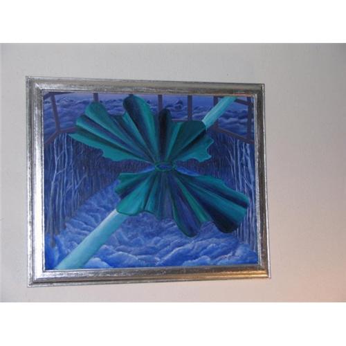 Fantasy butterfly riding on a light beam light beam in the clouds by E.Dornin<p>Original signed acrylic painting by artist E. Dornin<p>Acrylic on canvas with metal leaf treated wooden frame Frame Size: H= 18 1/2 x W= 22 1/2 Unframed Size: H= 16 1/2 x W= 20 1/2