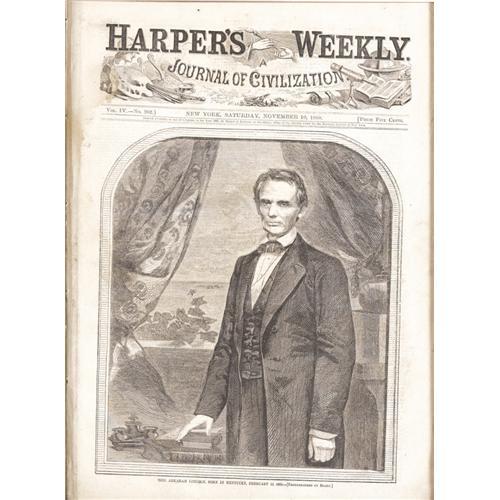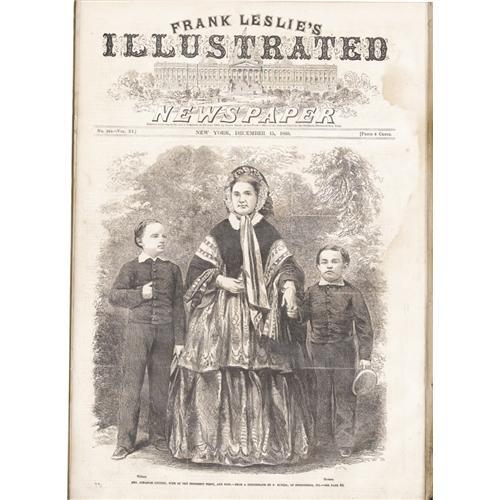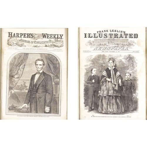 <B>Framed Pair of 1860 <I>Harper's Weekly</B></I></B></I> <B>Magazines.</B></I> <I>Harper's Weekly: A Journal of Civilization.</B></I> (New York: Harper Brothers, November 3, 1860), Volume IV, Number 201, 15 pages (689-704), elephant folio (11.25" x 15.75"). This edition is mostly concerned with the U.S. tour of the Prince of Wales. The cover page of the December 15, 1860 edition of <I>Frank Leslie's Illustrated Newspaper</B></I> is pasted down along back cover spine. The cover of this magazine depicts Mary Todd Lincoln and her two sons. As a whole, this volume shows brown staining throughout, and some chipping along the spine, but is otherwise very good.<BR><B><I>Harper's Weekly:</B></I></B></I> <I>A Journal of Civilization.</B></I> (New York: Harper Brothers, November 10, 1860), Volume IV, Number 202, 15 pages (705-720), elephant folio (11.25" x 15.75"). This edition of the long-running American political magazine depicts President-Elect Abraham Lincoln on its cover, and includes an artist's rendering of election night, where gentlemen in top hats watch election returns in the misty, gaslit streets of New York City. Condition is very good, with slight soiling to the front and back covers, and a few minor tears along the edges. A very attractive lot of consecutive editions of <I>Harper's Weekly,</B></I> including good Lincoln content.<BR><BR><b>Shipping:</b> Framed - with Glass, Medium (<a target="_blank" href="http://www.heritageauctions.com/common/shipping.php">view shipping information</a>)