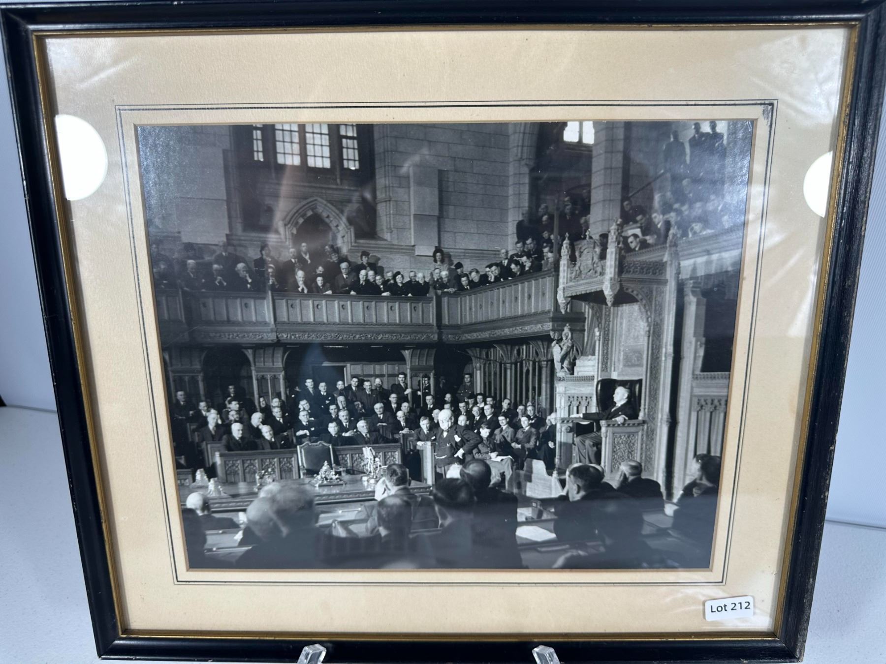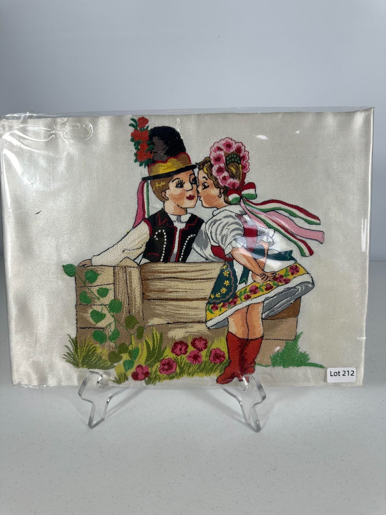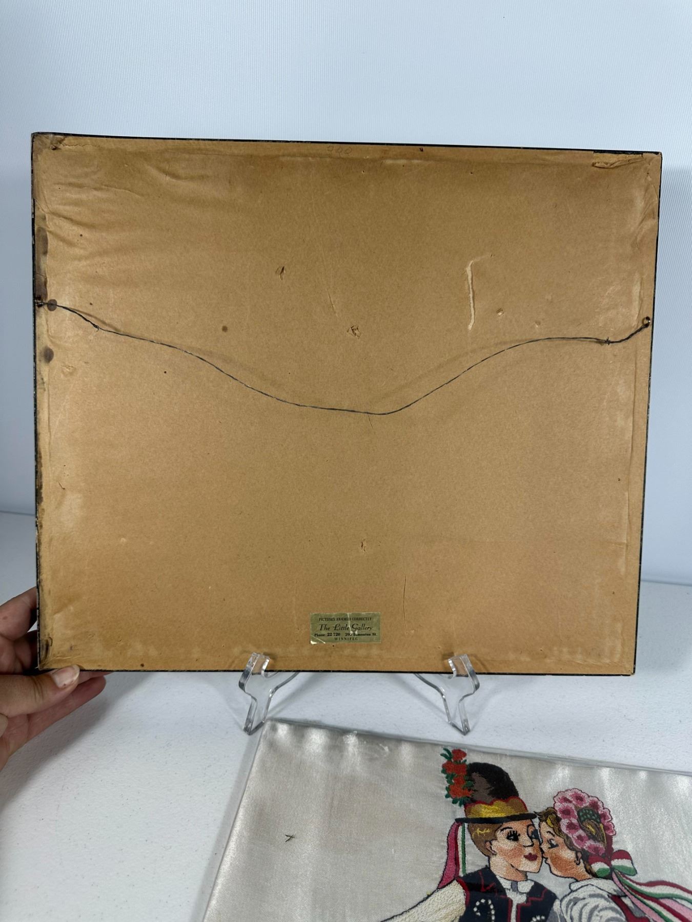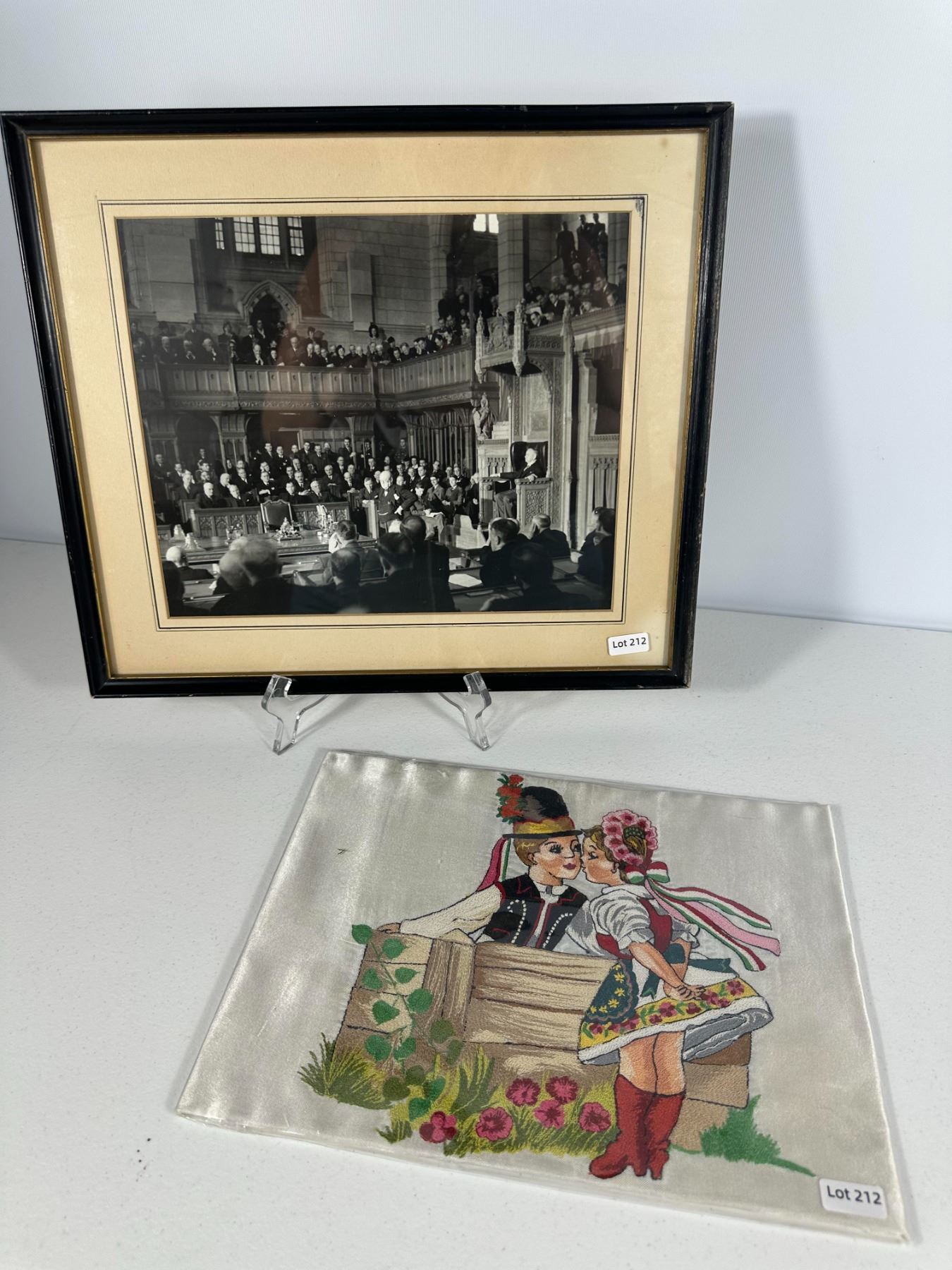 Vintage black‑and‑white photo of a parliamentary chamber in period mat and frame, together with a colorful embroidered silk panel of a folk couple.
