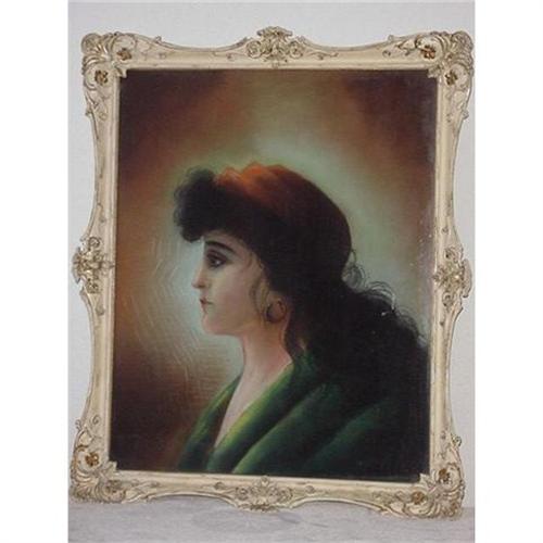 An antique pastel portrait, 23" X 19", on streached linen. A portrait of a young woman with flowing black hair. Antique frame and wavy old glass. Signed A. Britt '02' lower left.