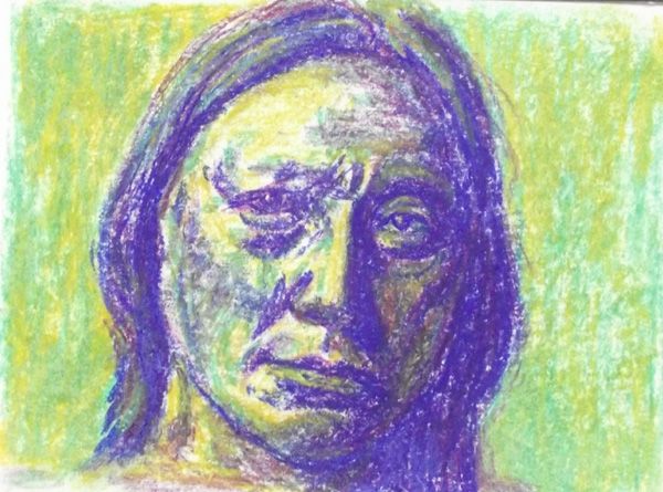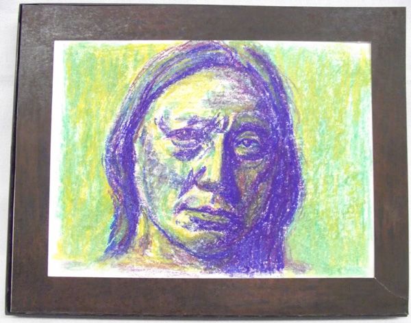 Framed Pastel of Native American Man's Face. This portrait of a thoughtful man is done predominately in blue, green and yellow-gold. It measures 6.5''Hx9'' and is inside a plastic frame with acrylic cover.