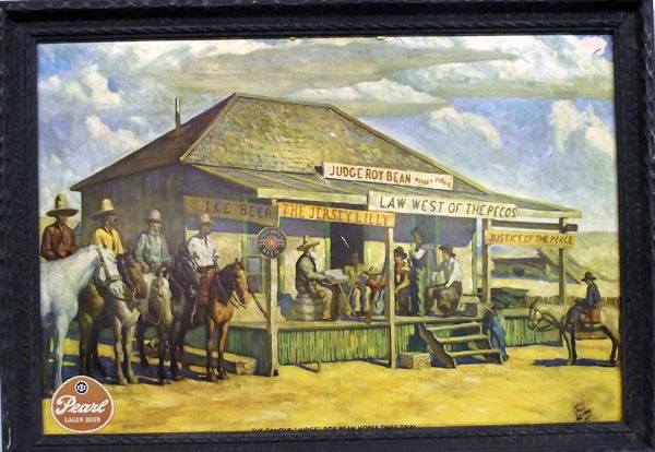 Framed Pearl Lager Beer Advertising Picture. The Pearl Brewing Company was an American brewery, established in 1883 in San Antonio, Texas, USA. In 1985, Pearl's parent company purchased the Pabst Brewing Company and assumed the Pabst name.  Pearl beer is still in being brewed at Miller's Ft. Worth, TX.  This Unique Picture is titled "Famous Judge Roy Bean Horse Thief Trial" was done by Paul Lehman. It has a visual Measurement of approx. 24''H x 35''W. It does have a small scratch in it's middle area.