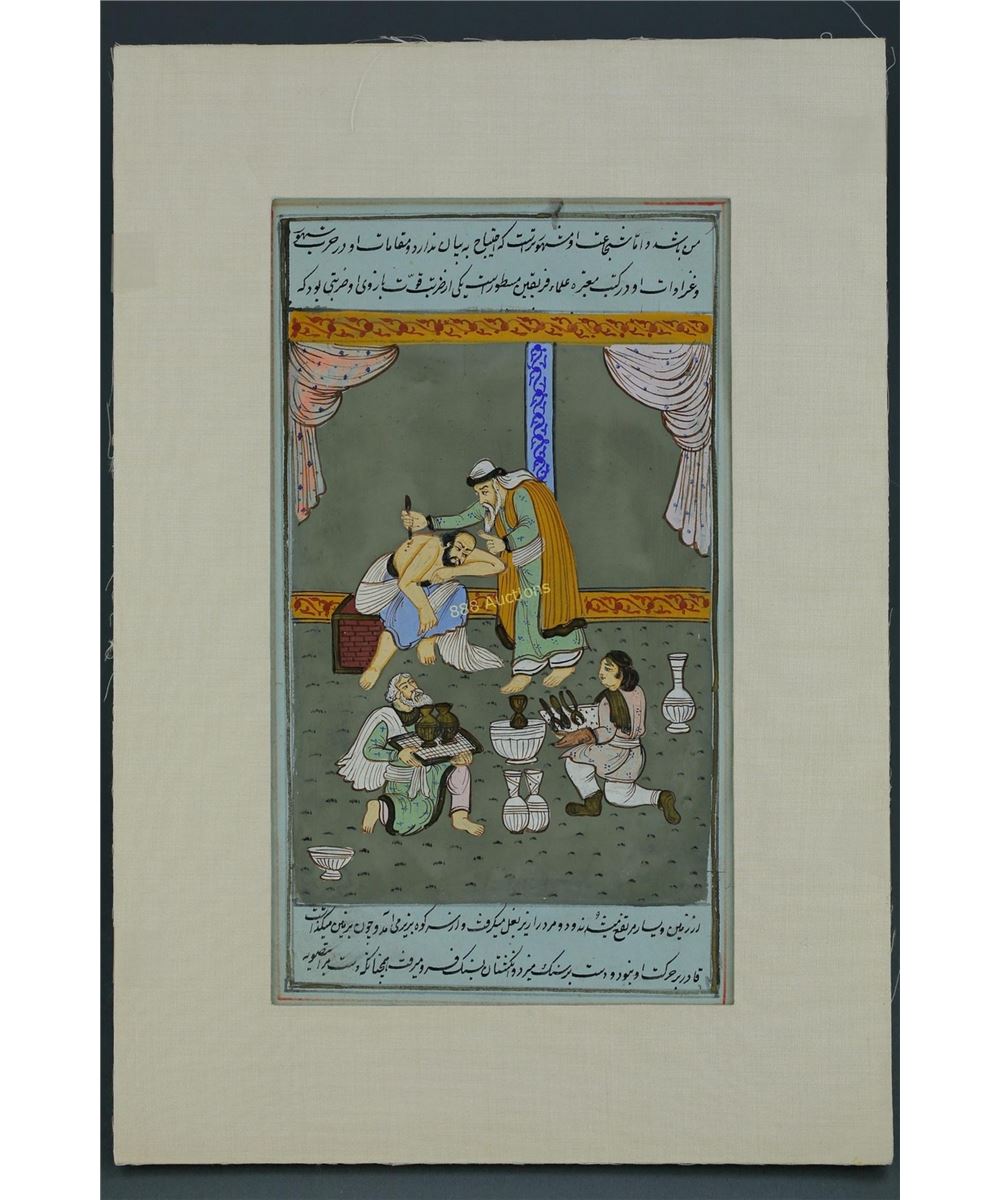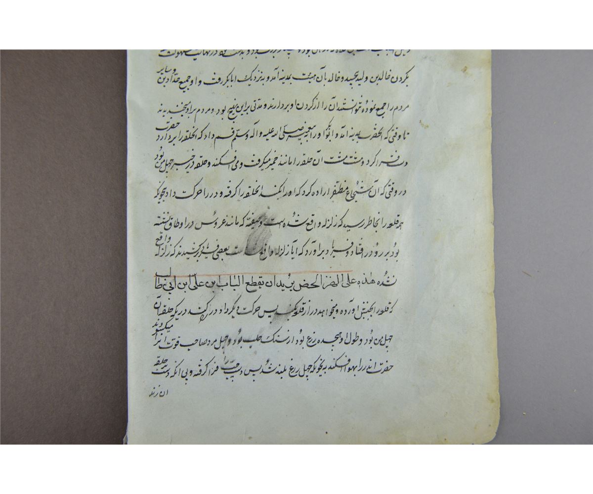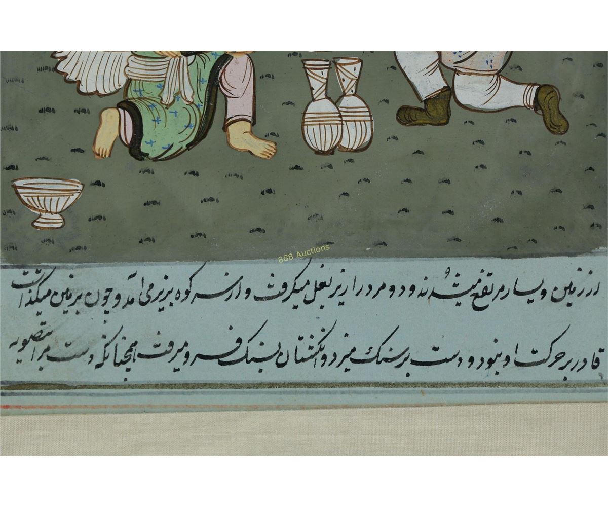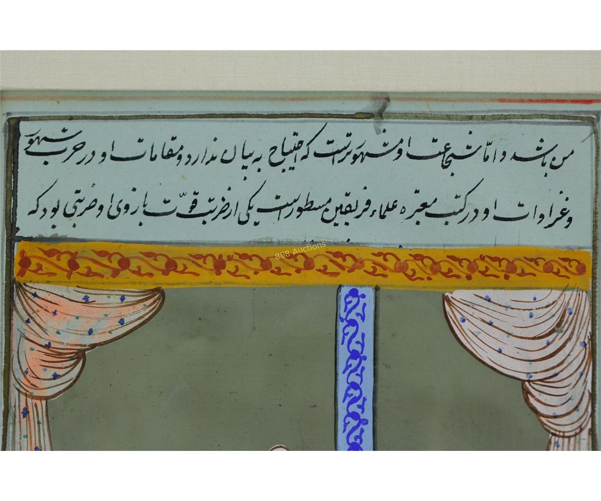 Framed hand painted Persian watercolour painted manuscript leaf, bearing inscriptions to the reverse; 26.5 cm x 15 cm