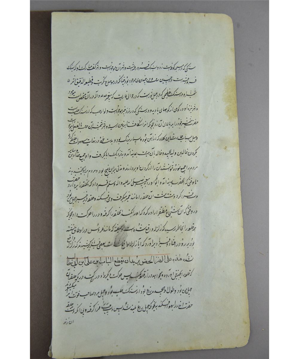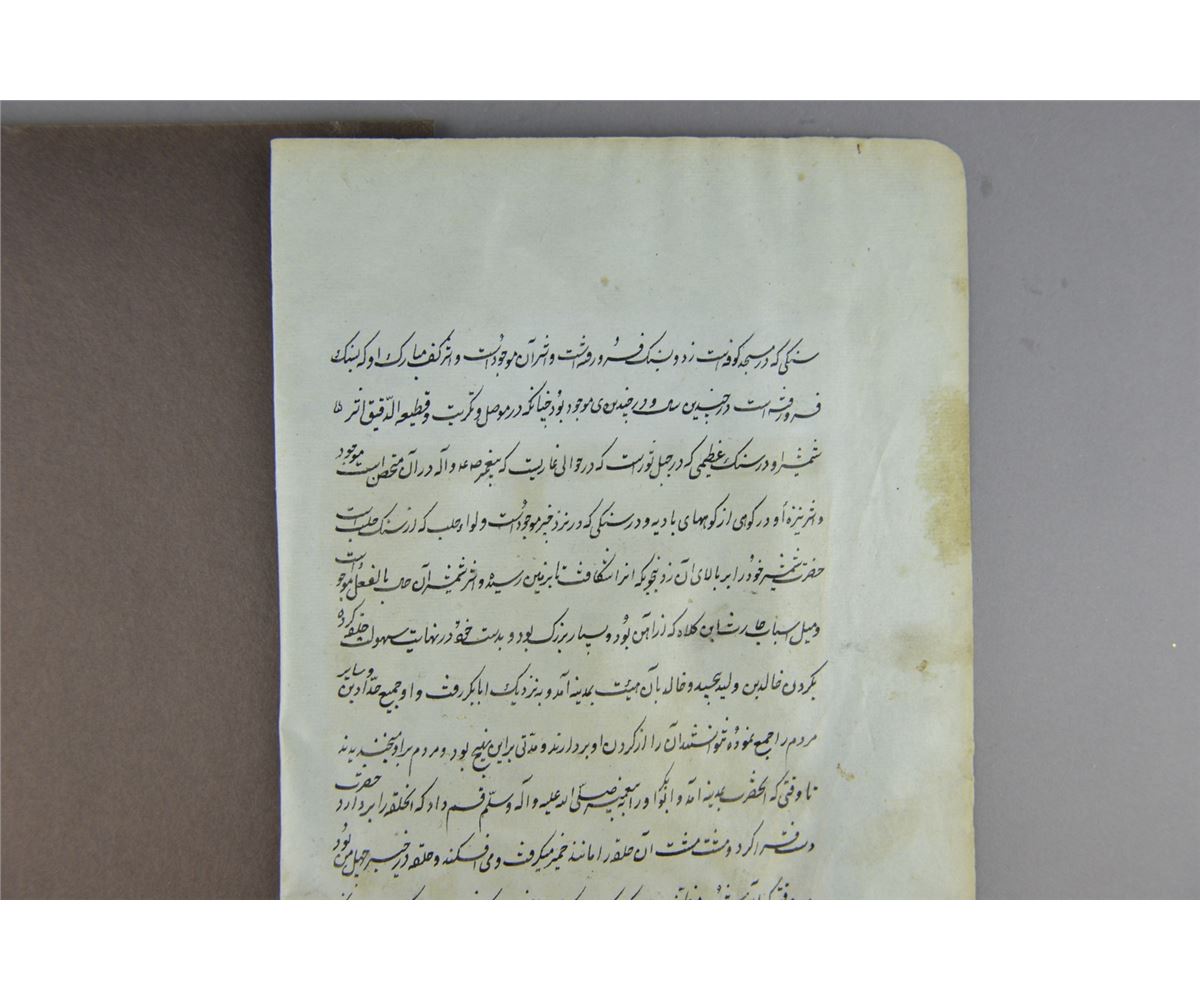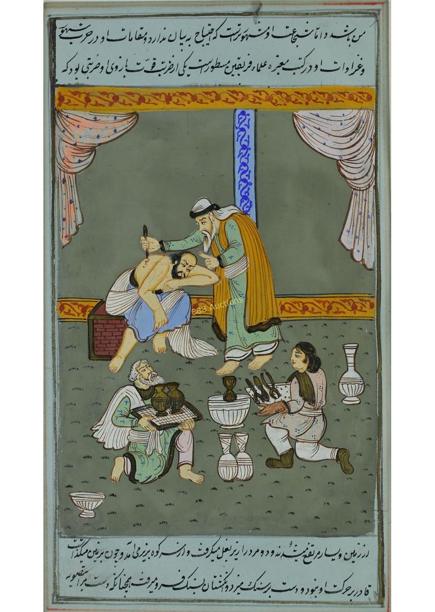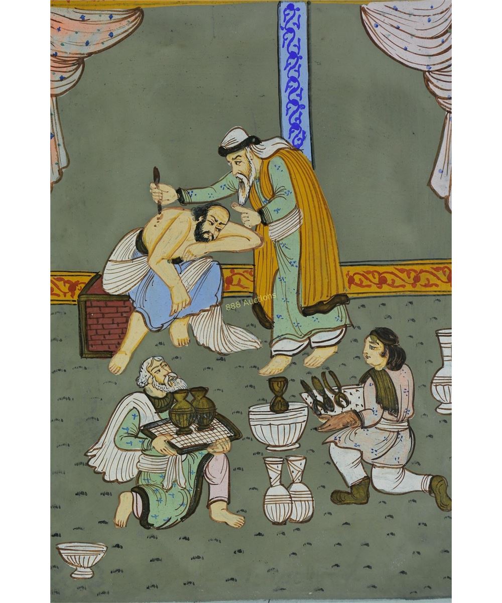 Framed hand painted Persian watercolour painted manuscript leaf, bearing inscriptions to the reverse; 26.5 cm x 15 cm