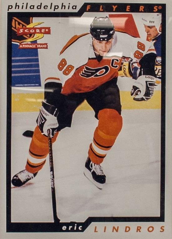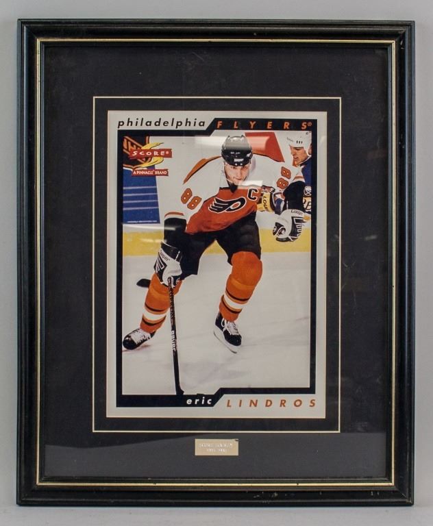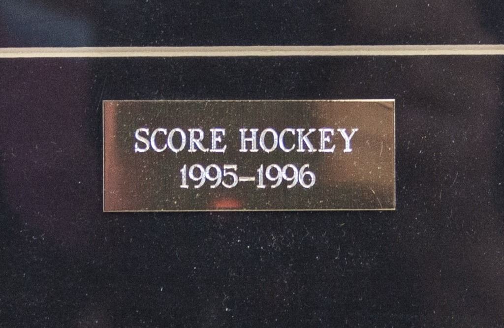 Photograph of Eric Lindros in play, framed. Plaque beneath photo reads "SCORE HOCKEY 1995-1996".