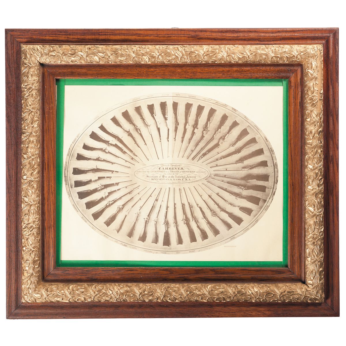 Oval period photograph of 40 breech loading Civil War carbines manufactured by various makers in a 30 1/4" x 26 1/4" wooden frame. The Manufacturers name is on the outer rim and the center reads "Breech Loading/CARBINES,/submitted by INVENTORS to a BOARD of OFFICERS convened/by order of the/Secretary of War at the National Armory/SPRINGFIELD, MASS. U.S.A./on the Fourth of January 1865". The hardwood frame is varnished with a raised floral carved and gold painted trim and is glass covered. Good with some crazing of the varnish and a small crack on the lower right hand corner.