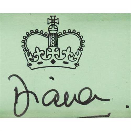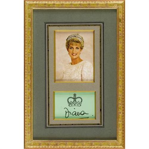 <B>Framed Photograph of Princess Diana with Signature</B></I><BR><I>Circa 1996</B></I><BR><BR>Depicting Diana in a cream colored pearl-encrusted gown, wearing a pearl and diamond tiara and pendant earrings, a separate card with Royal crown signed <I>Diana</B></I>-framed, photo-3 5/8 x 2 ¾ in.; card: 2 x 3 in.; frame: 11 x 7 ½ in.<BR><BR>Provenance:<BR>Purchased from Hope & Glory, London<BR><BR><b>Shipping:</b> Requires 3rd Party Shipping (<a target="_blank" href="http://www.heritageauctions.com/common/shipping.php">view shipping information</a>)