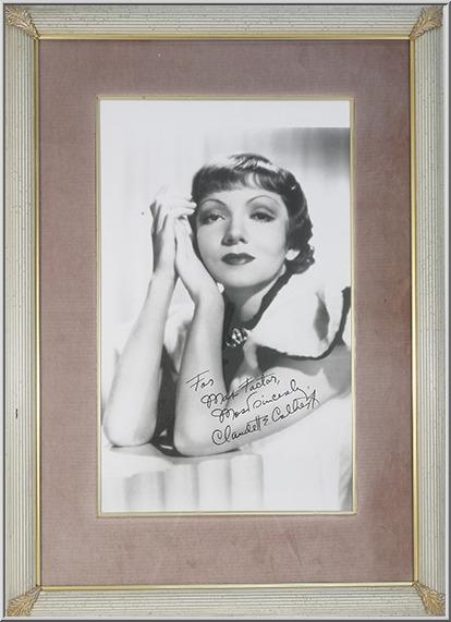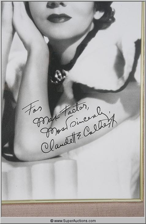 Original Framed Photograph of Claudette Colbert with an Autograph which states "For Max Factor Most Sincerely Claudette Colbert." This is an original picture which was located at the Max Factor Studio. This piece is part of the Max Factor Collection. (31 1/2 L x 43 1/2 H)