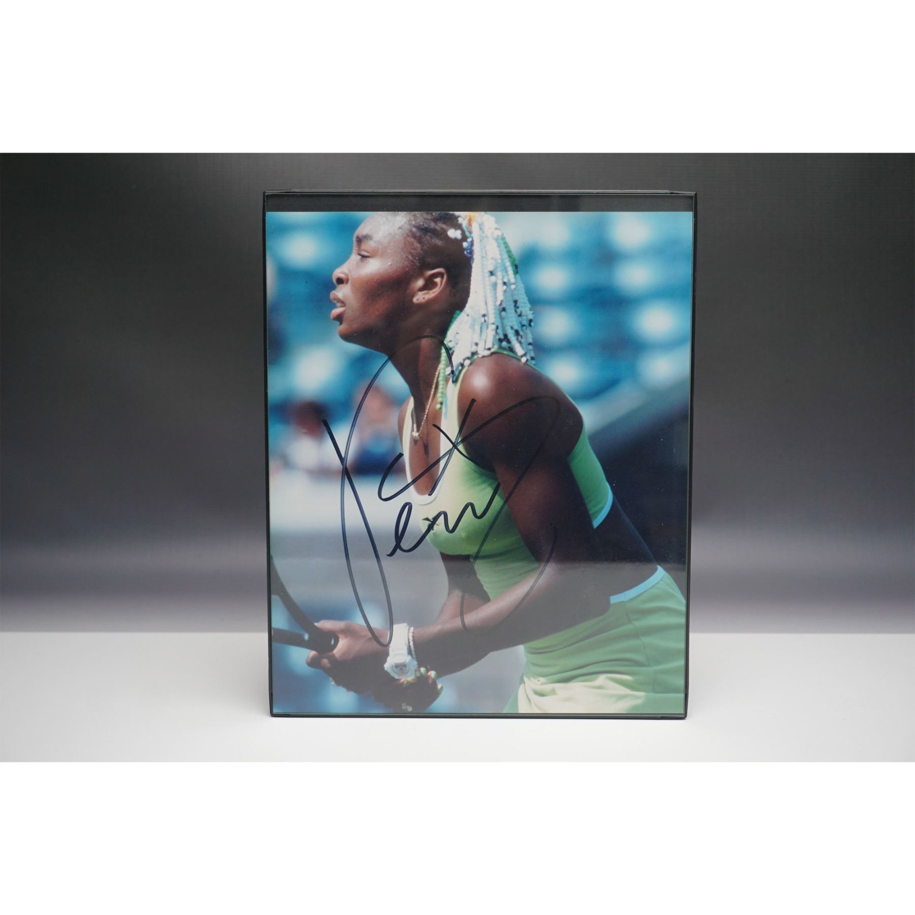 Framed autographed photograph of tennis champion Venus Williams during the 1998 US Open Tennis Championships. This image captures Williams in action as she returns a shot to Anne Kremer of Luxembourg during their second-round match at the USTA National Tennis Center on September 3, 1998. Showcasing her signature beaded hairstyle and focused intensity, this signed photograph is a remarkable piece of tennis history. The autograph is prominently displayed across the image, adding to its collectible appeal. Encased in a black frame that measures 8"L x 10"H, this piece is suitable for both hanging and standing display. A must-have for tennis enthusiasts and sports memorabilia collectors.