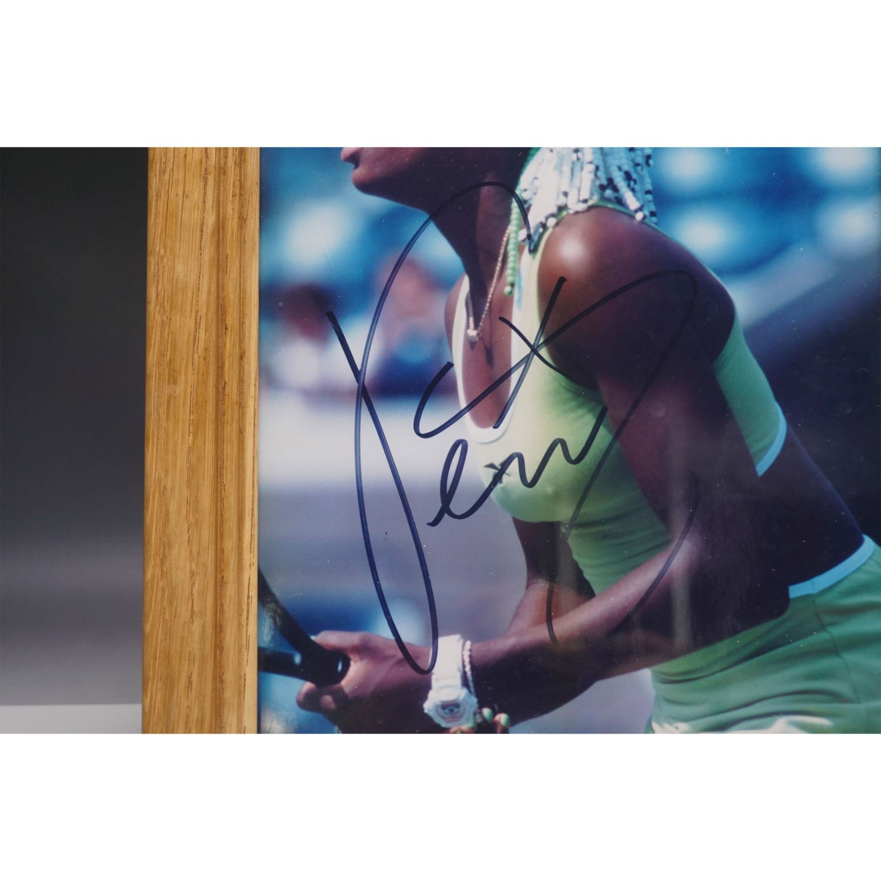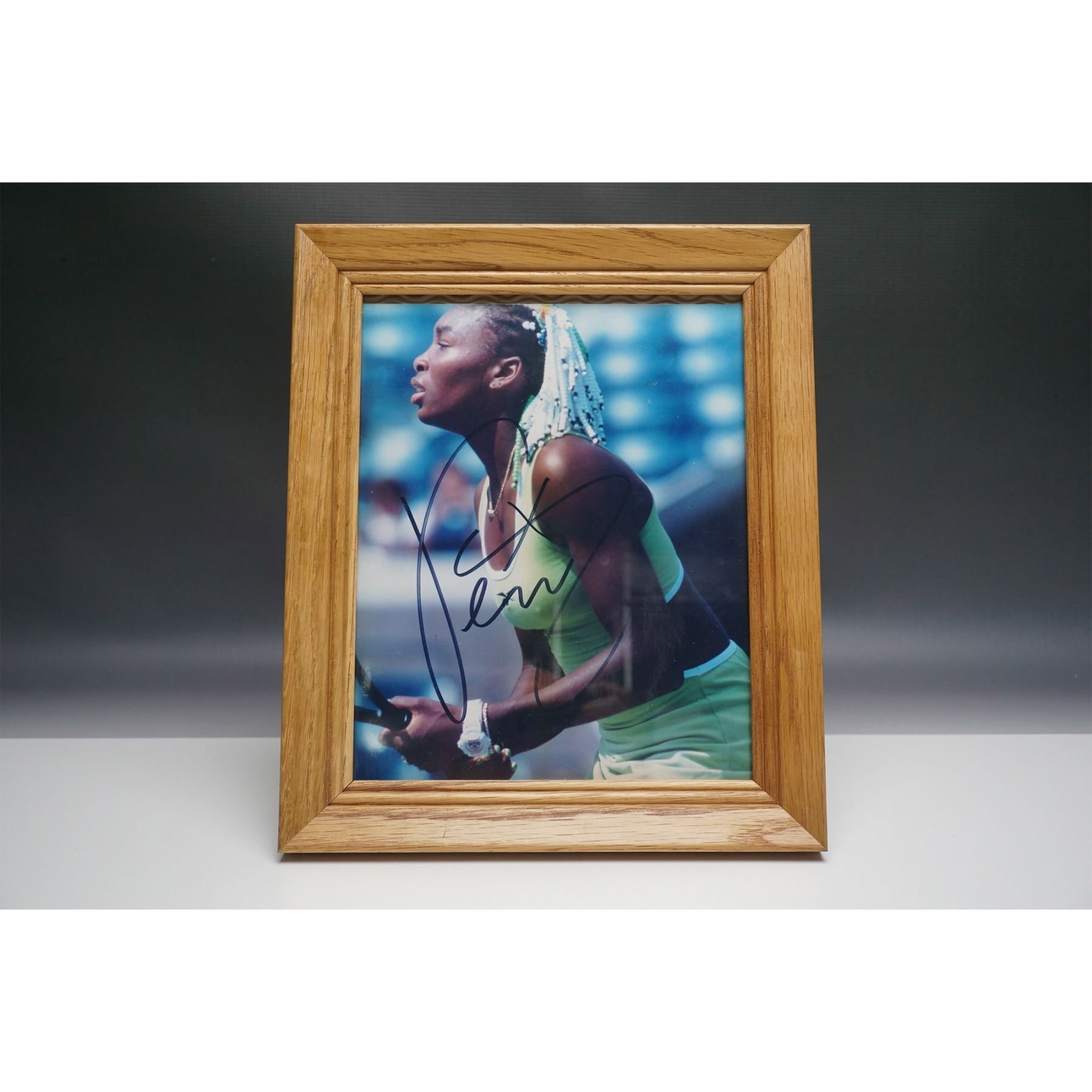 Framed autographed photograph of tennis champion Venus Williams during the 1998 US Open Tennis Championships. This image captures Williams in action as she returns a shot to Anne Kremer of Luxembourg during their second-round match at the USTA National Tennis Center on September 3, 1998. Showcasing her signature beaded hairstyle and focused intensity, this signed photograph is a remarkable piece of tennis history. The autograph is prominently displayed across the image, adding to its collectible appeal. The back of the frame includes a sticker reading "Certificate of Authenticity, by Aaasoft," verifying the signature’s authenticity. Encased in a classic wooden frame measuring 10"L x 12"H, this piece is suitable for both hanging and standing display. A must-have for tennis enthusiasts and sports memorabilia collectors.
