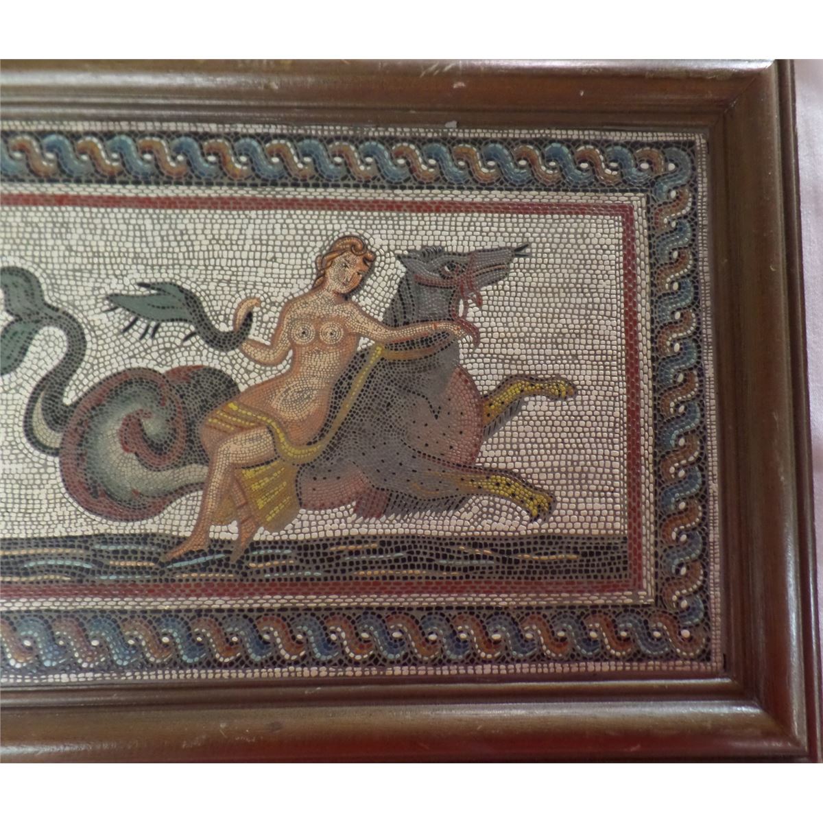 Framed picture of a Middle Eastern naked woman on a stylized mythical animal. This item is 1987. We cannot determine the medium; however very intricate and looks to be inlay. The item measures 16 1/2 x 11 1/2 inches. There is also "signature or title on the back" Please see pictures. Shipping $22.00 - Very heavy
