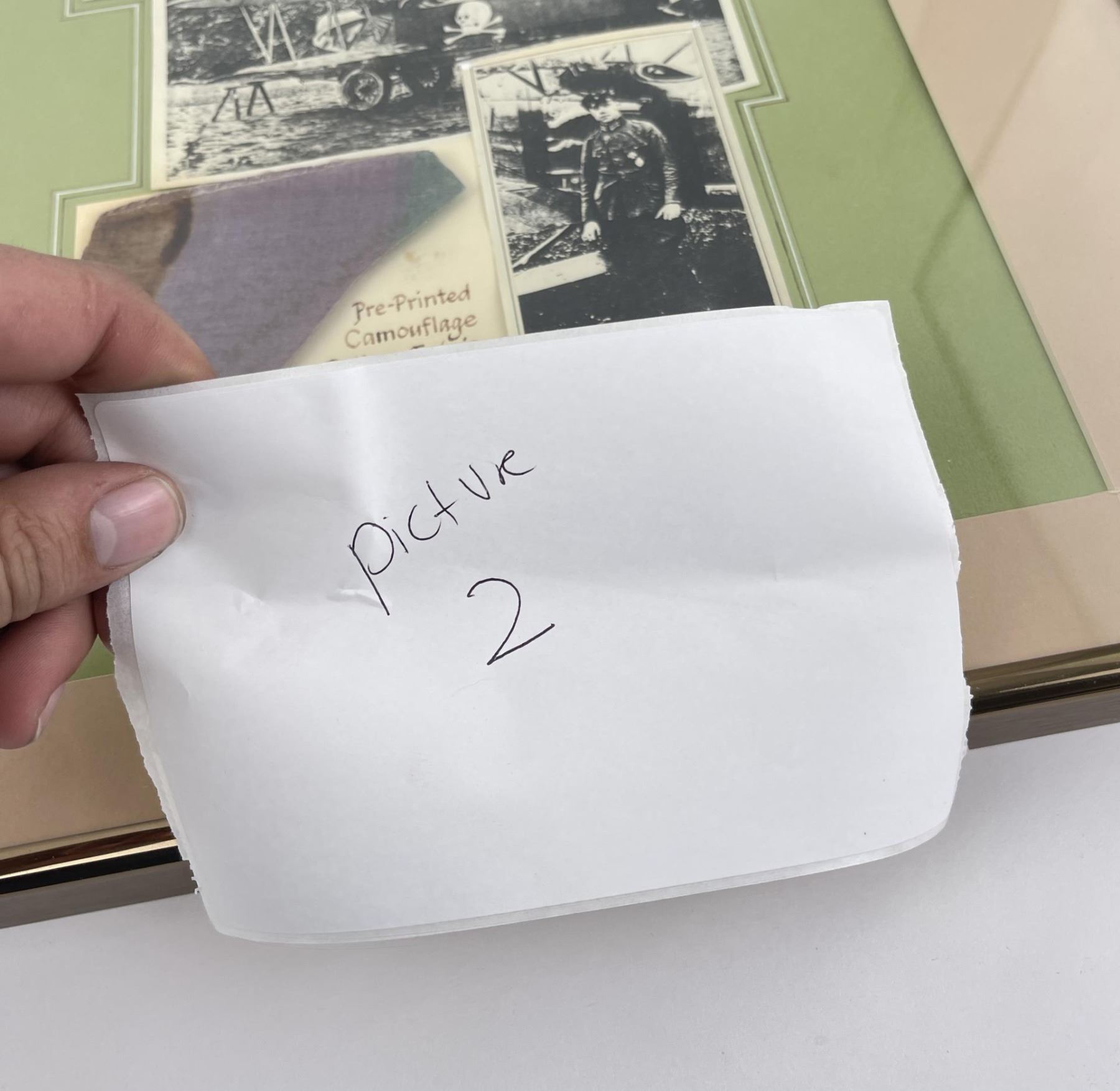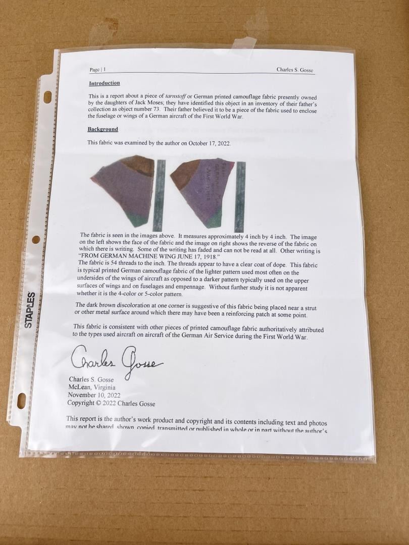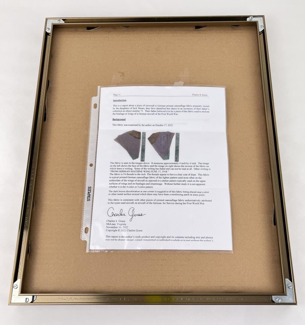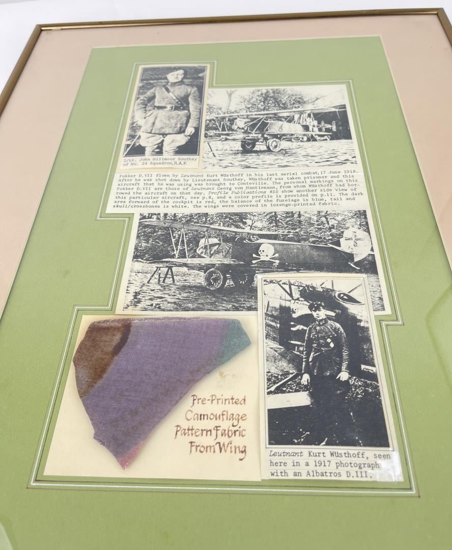 Fabric is from the wing of German Fokker D-7 aircraft flown by 27 victory ace Kurt Wusthoff. Wusthoff was shot down in aerial combat on 17 June 1918 by Lt. Southy of 24 Squadron, British Royal Flying Corps. Wusthoff was captured and became a prisoner of war. The fabric measures 4" long by 3-1/2" wide at its widest point. It is displayed in a matted frame that provides the combat history of the fabric. The frame measures 16" wide by 20" long. The fabric comes with a letter of authentication. The fabric and display are in sound condition.