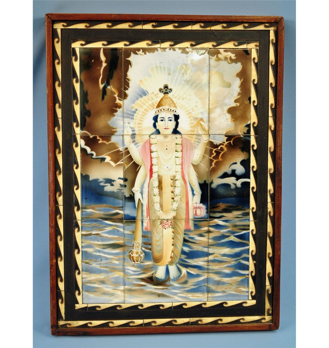 Framed porcelain plaques of Hindu Goddess Vishnu. Outer frame is mahogany. Outer portion of plaques are surrounded by plaques of a wave design separated by .62" inch mahogany strips. Vishnu is the Almighty Supreme God of Hinduism. Dimensions - 16.25" X 22.5";Good condition.
