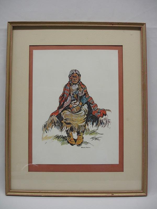 Framed Print ''Apache Squaw'' by Fred Harman. Visual measures 12''x9''. Painted wood framed, under glass with mat. Some chips on frame. SHI $35.