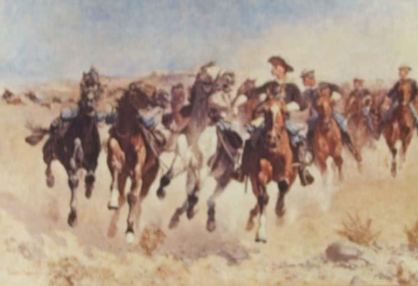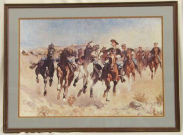 Framed Print Dismounted By Frederick Remington. Framed in a wood frame, double matted, under glass. Visual measures approx. 16''H x 23 1/2''W. Buyers Pay Actual Shipping and Handling Charges(see terms and conditions for more information).