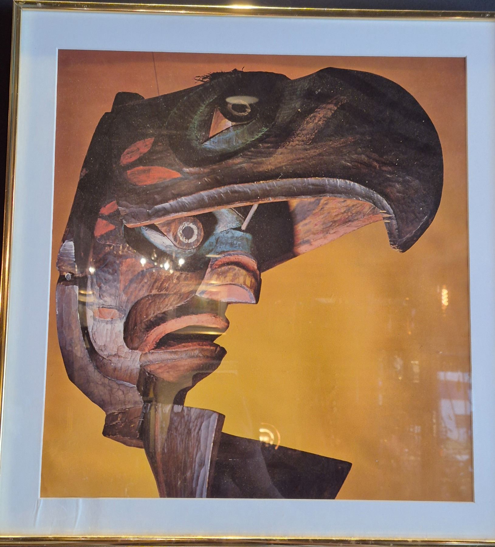 Vivid museum-quality print of a carved Thunderbird mask from the BC Museum of Anthropology. Deep cultural power. Framed and striking.