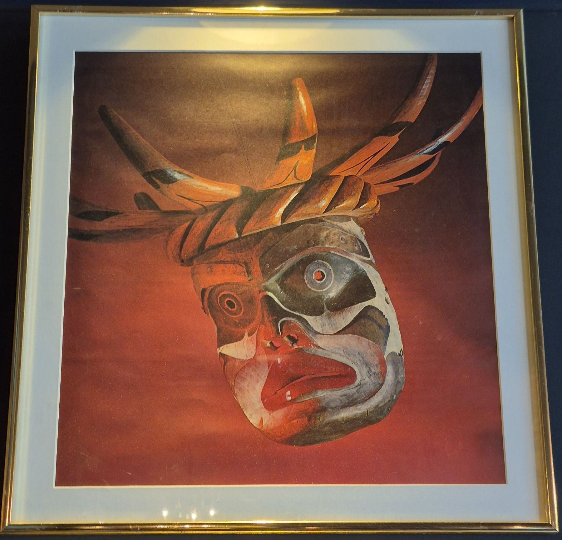 Bold print featuring a ceremonial Indigenous mask from BC’s Museum of Anthropology. Vivid colors and powerful expression. Framed and eye-catching.