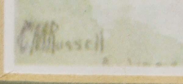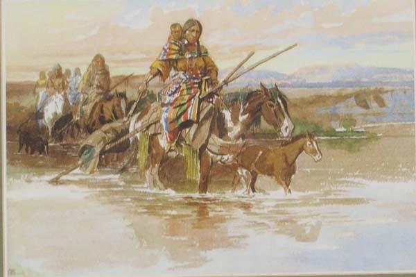 Framed Print, River Crossing, By C. Russell. Framed in a wood frame, double matted, under glass. Visual measures approx. 9 1/2''H x 14''. Buyers Pay Actual Shipping and Handling Charges(see terms and conditions for more information).