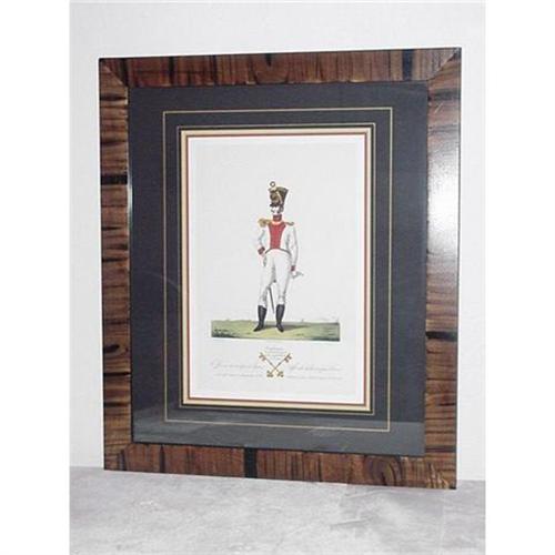 A reproduction framed print titled "Officier de Troupes" of the Napoleon era. A very decorative framed print, 27 1/2" tall, 23 1/4" wide, triple matted with gold detailing, the frame made to resemble a faux wood frame will add a period look to your room. Condition is good, unfortunately I was moving the picture and when I picked it up I cracked the glass and it will have to be replaced so I'm lowering the reserve to $40.00. The picture is very nice and will be a very decorative addition to any room, but you will have to have the glass replaced. There are some minor scratches to the frame. (8)
