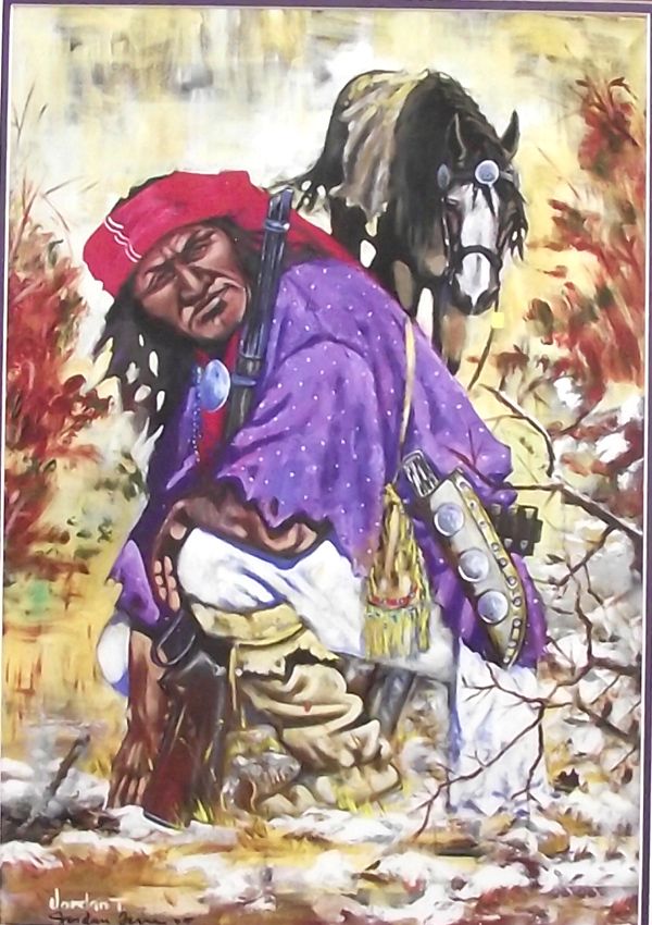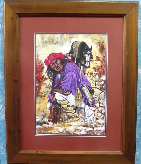 From the Collection of Nick & Suzanne Nicholas. Jordan Torres is an Apache artist whose goals are clear and undeviating. Jordan's sculptures and paintings reflect this idea; beautiful, honest, and very direct. Mr. Torres, born and raised on the Mescalero Apache Reservation, is a direct descendant of famed Apache Chief Cochise and Chief Naiche. This Brilliant piece has a visual measurement of 21'' x 15''