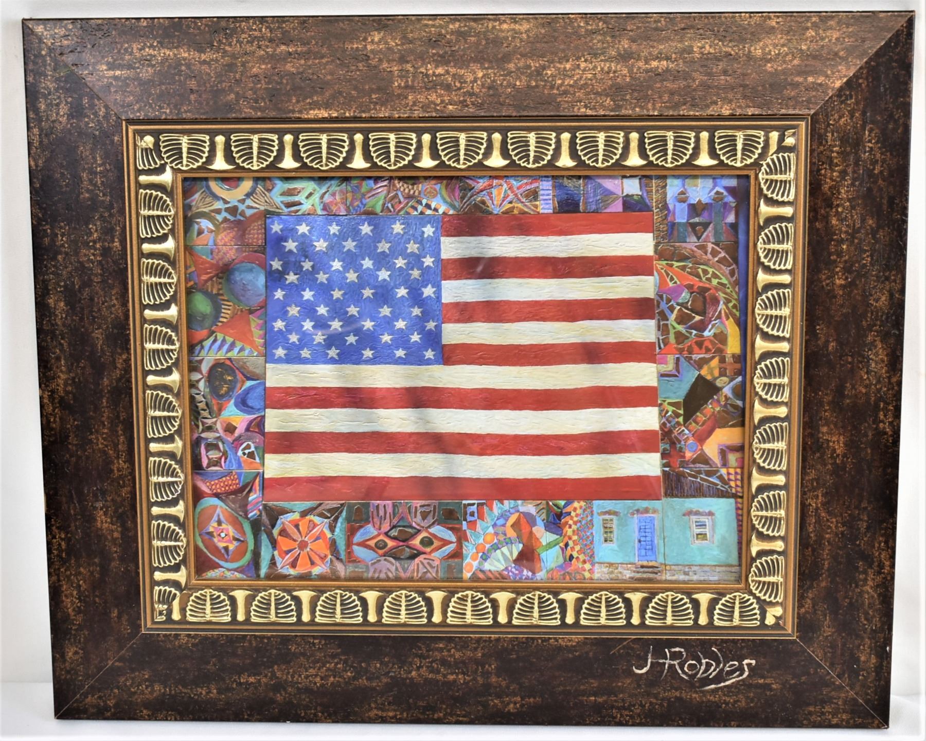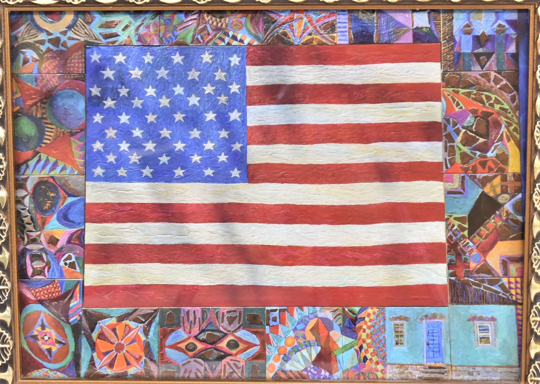 Framed Print ''Mi Flag'' by Jose Robles, framed and under glass, beautifully framed, FYI: ''Jose Robles is from Douglas, Arizona and resides in Tucson. He went to school at the University of Arizona and Golden Gate University. All of his artwork is painted using a toothpick. He started initially by painting garden pots. He has no formal arts training. He is the Arts and Crafts winner for painting in the the Arizona Attorney Magazine in 2009 and 2012. Jose has exhibited his work at La Pilita Museum in Tucson in 2008, 2010 and 2011. Most recently, his works have been shown at the Tubac Center of the Arts in September 2017 for the exhibition called '19', and May 2018 as part of the art presentation titled Sur del Arizona & Norte de Mexico.''