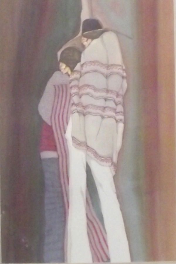 Framed Print of Native Americans. The nicely matted and framed print is serene turquoise and mauve. It depicts a man and woman wrapped in blankets in a style similar to Pena. The visual measures 6.5''Hx6.75''W. The frame is wood and has some scratches and small chips. Triple mat and under glass.