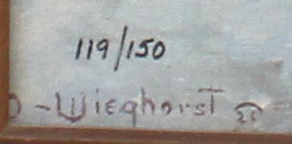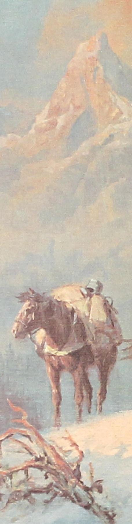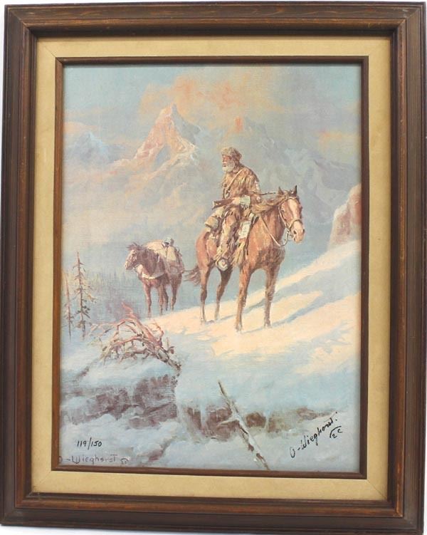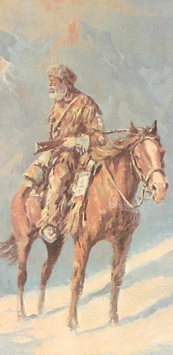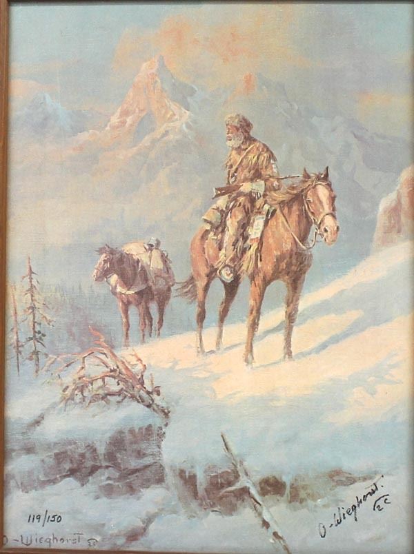 Framed Print on Canvas ''Rocky Mountain Trapper'' by Olaf Wieghorst (1899-1988), #119/150 and hand signed by the artist, visual measures 11.5'' x 15.5'', overall framed measurement of 16.5'' x 20.5'', FYI: ''he left the entertainment world to work on a stock farm where he honed his riding skills and started to paint. In 1918, he traveled to New York and made his way west by enlisting in the U.S. Cavalry. During this time, he continued to build his skill as a painter. Returning to New York in 1923, artist Olaf Wieghorst became a mounted policeman, rode the rodeo circuit, and sold his western paintings. By 1942, his popularity allowed him to return west and paint full time. Olaf Wieghorst's prints and paintings include works commissioned by cowboy legends Roy Rogers and Gene Autry. Some of his artwork is displayed in the National Cowboy Hall of Fame.''