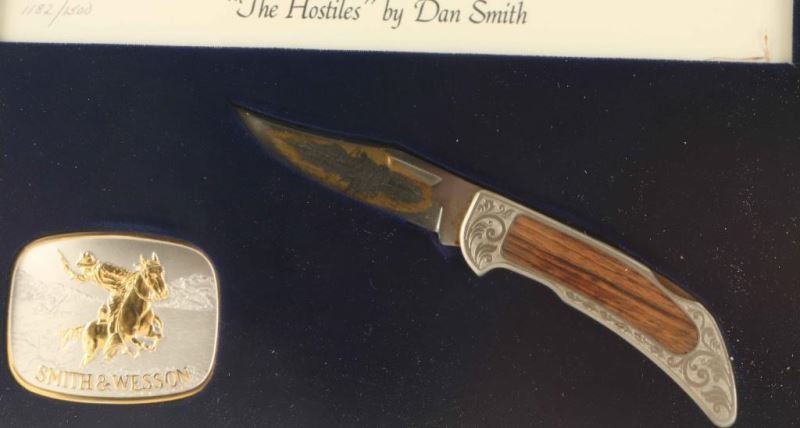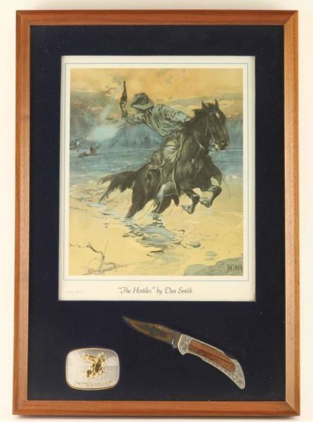 "The Hostiles" by Dan Smith 105/1500, signature lower right image measures 12"x10" in mat with lower cut outs that display a knife and belt buckle from Smith & Wesson. Overall measures 23 1/2"x16 1/2"x2"