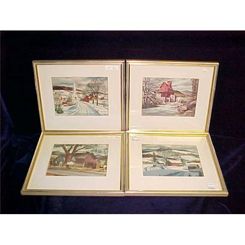 Framed Prints - Nature Scenes of Fall/Winter - Set of 4. Horse & Buggy Through the Snow, Farm Along a County Road, Home on the River and Chapel in the Snow. Matted and framed - frames in fair / rustic condition. Prints are in great condition.