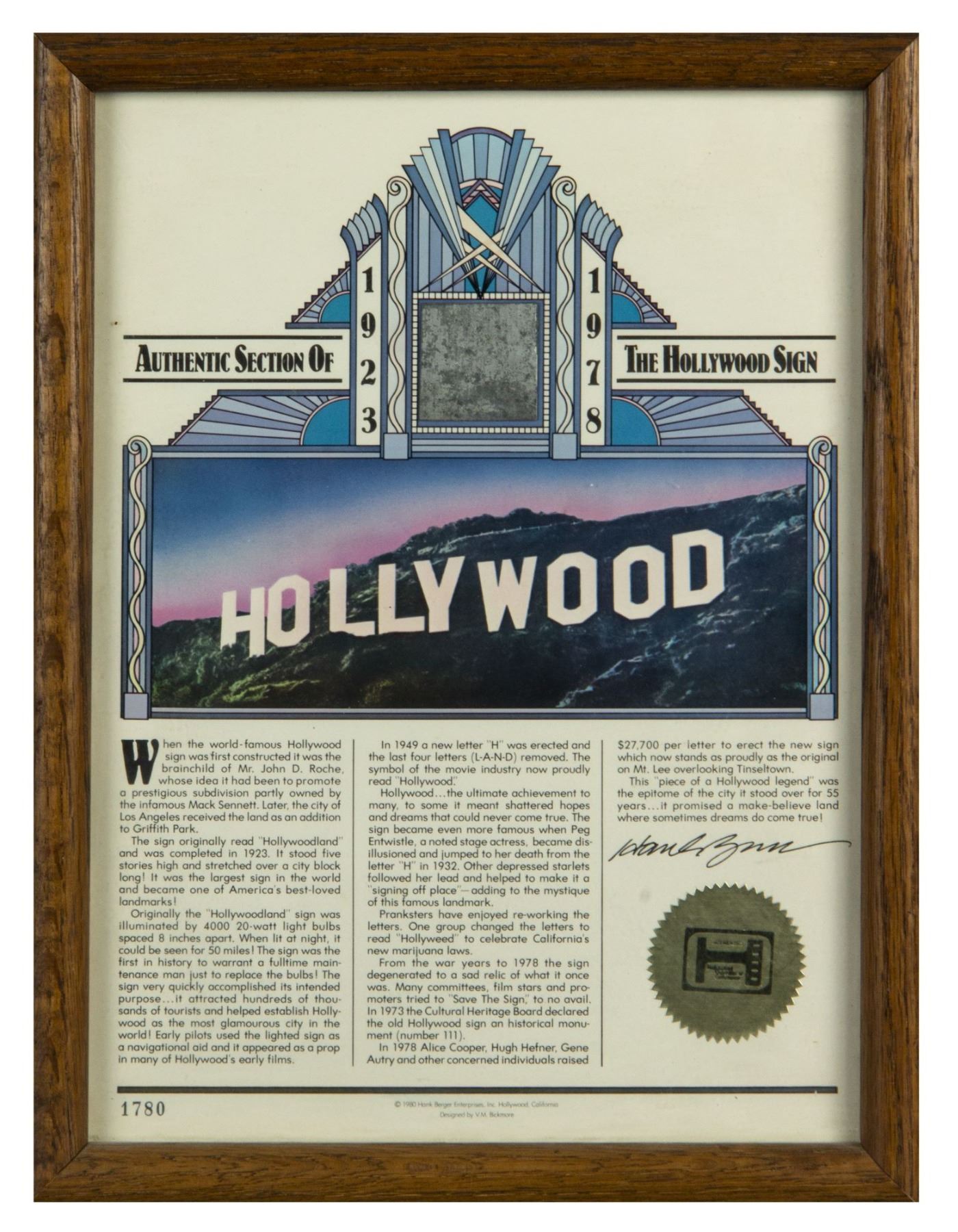 (1923-1978) An original framed section of the first Hollywood sign that was erected in 1923 and removed in 1978. The sign originally read "Hollywoodland" before the letters "land" were removed in 1949. The sign suffered wear over time, which would result in Alice Cooper, Hugh Hefner, and Gene Autry, among others, raising $27,700 per letter to replace the sign. Entrepreneur Hank Berger would eventually acquire the original letters, after recognizing the significance of their historic and intrinsic value. Berger would become infamous for cutting small sections out of the metal letters and creating these commemorative plaques. The plaque tells the story of the Hollywood sign, and includes a gold foil seal and is numbered 1780. The overall frame size is 13.25"x10.25", with the Hollywood sign section measuring just under 1.5"x1.5". The condition is very good with little wear to the frame.