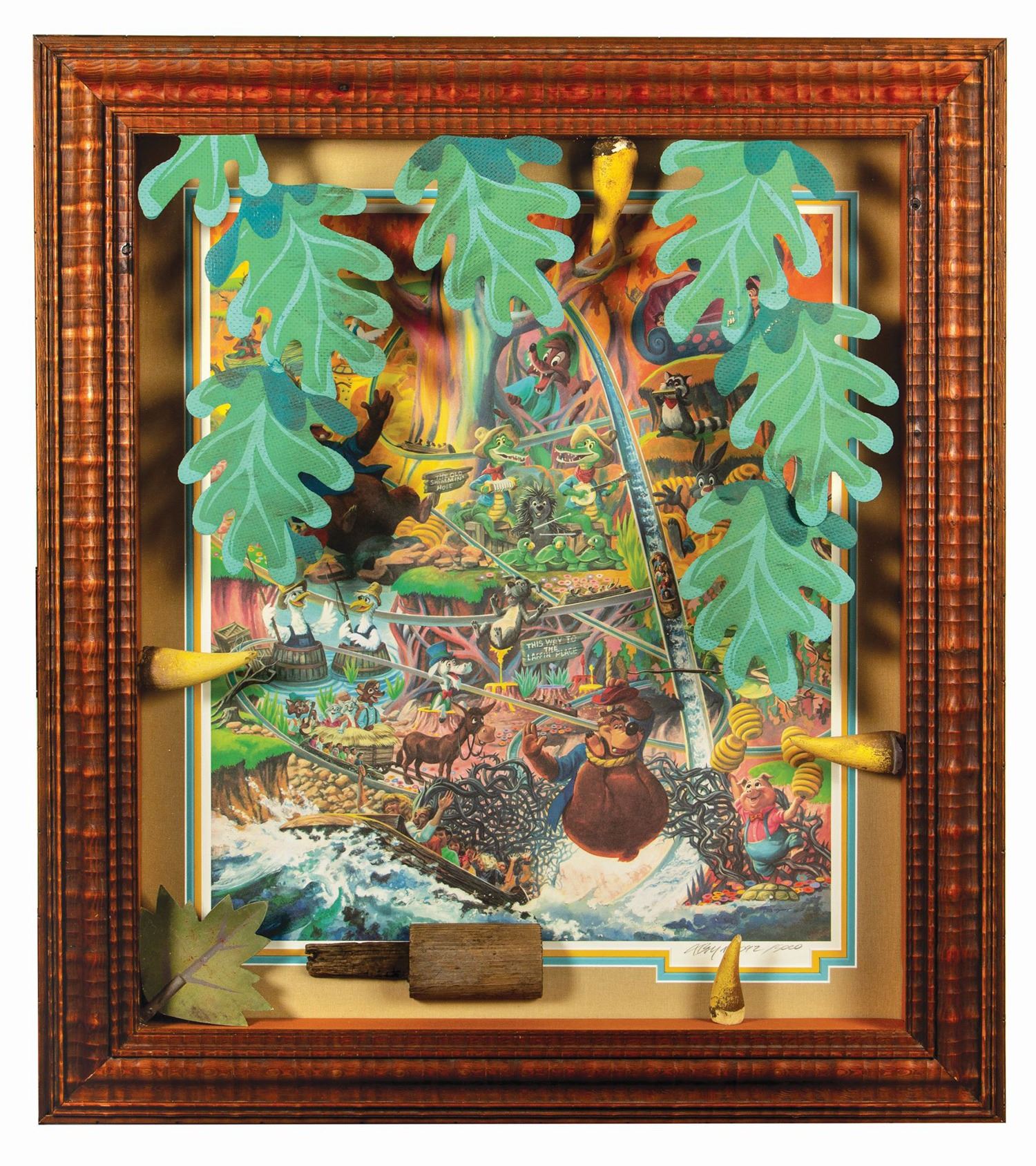 (Disneyland, c.1989) A framed set of props from Splash Mountain, displayed over a signed print by Charles Boyer which was created to commemorate the opening of the attraction at Disneyland. The print is titled "The Laffin' Place" is signed and numbered 2092/5000. The props within the frame include a hard-vinyl leaf, (4) thorns, and a section of wood. The plexiglass has additional prop vinyl leaves adhered to the surface in (2) strands of leaves and an additional single leaf. The frame measures 35"x30.5" and is in very good condition.