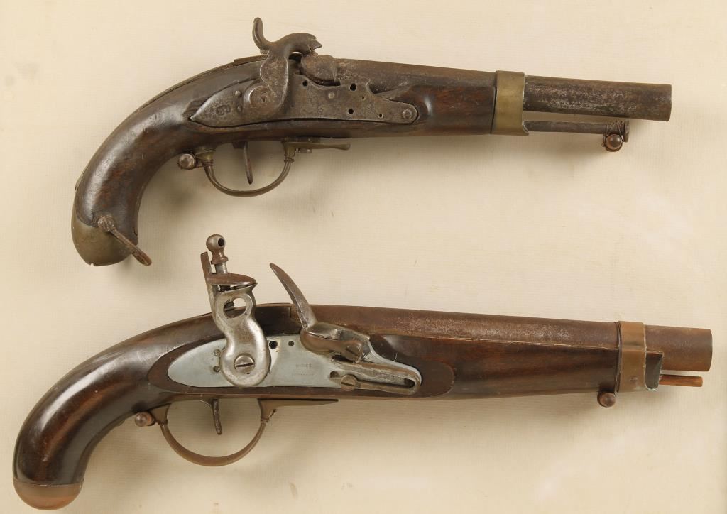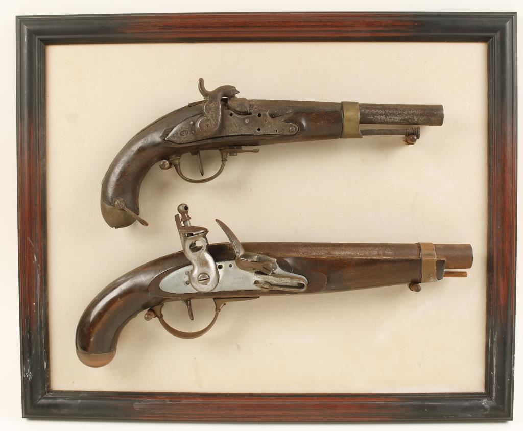 Nice display of an unmarked percussion conversion pistol and a flintlock pistol marked " Hawes Germany". Both missing parts and in poor condition.